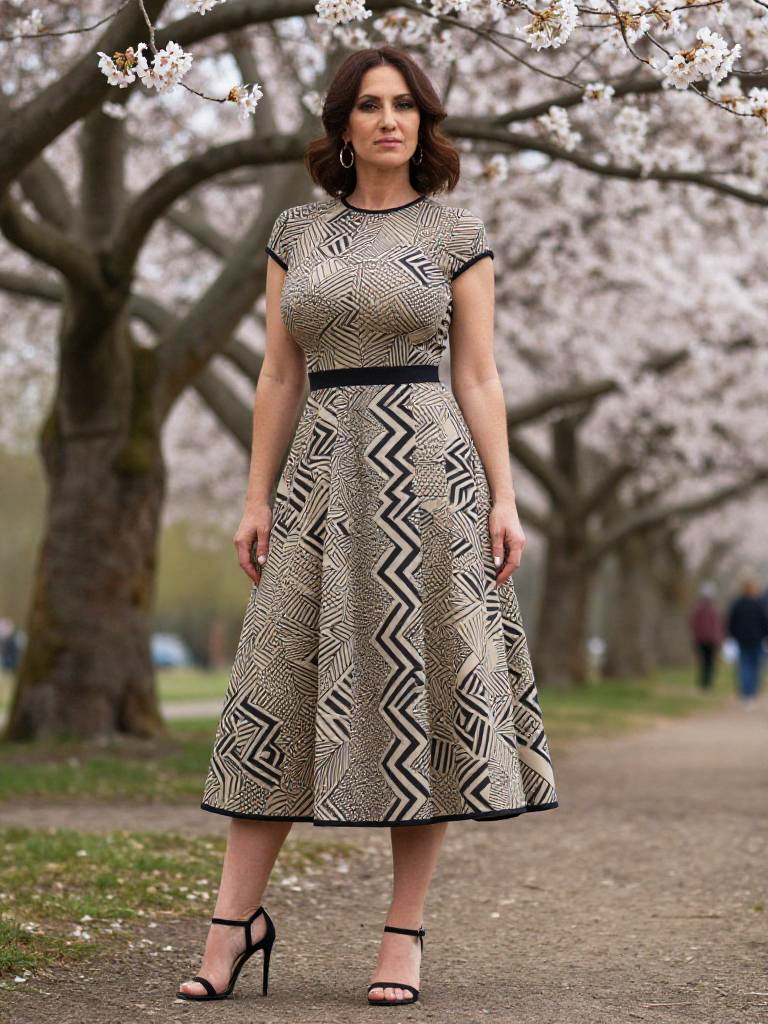 A woman in a geometric-patterned, beige and black zigzag A-line dress with cap sleeves, black trim, and black high-heeled sandals, set in a botanical garden under the cherry blossoms, in the visual style of Gottfried Helnwein. Sexy. Pretty face and beаutiful eyes. Big breasts