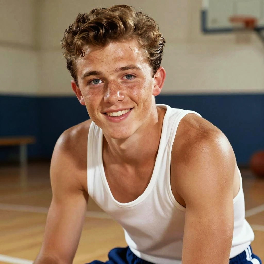 Cinematic high-resolution photo of energetic teenage boy with curly red hair and freckled skin at modern urban rooftop basketball court with cityscape backdrop. Wearing grey sleeveless athletic shirt and black shorts, droplets on skin, relaxed half-smile, looking straight at the camera. Sunlit water with crisp ripples, palm fronds and modern lounge chairs in the background, white towels, clean architectural lines. Golden highlights, natural color grading, shallow depth of field, soft lens flare, subtle film grain, accurate skin tones, refined highlights on water, gentle breeze ruffling the surface, editorial yet natural vibe.