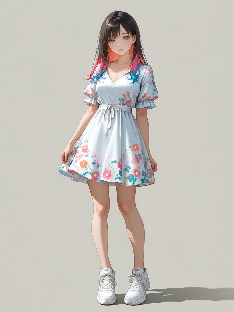 1girl, realistic face, full body shot, Woman, casual chic, floral print midi dress in vibrant multicolor, V-neck, short flutter sleeves, front slit, fitted waist, white sneakers, simple studio background.