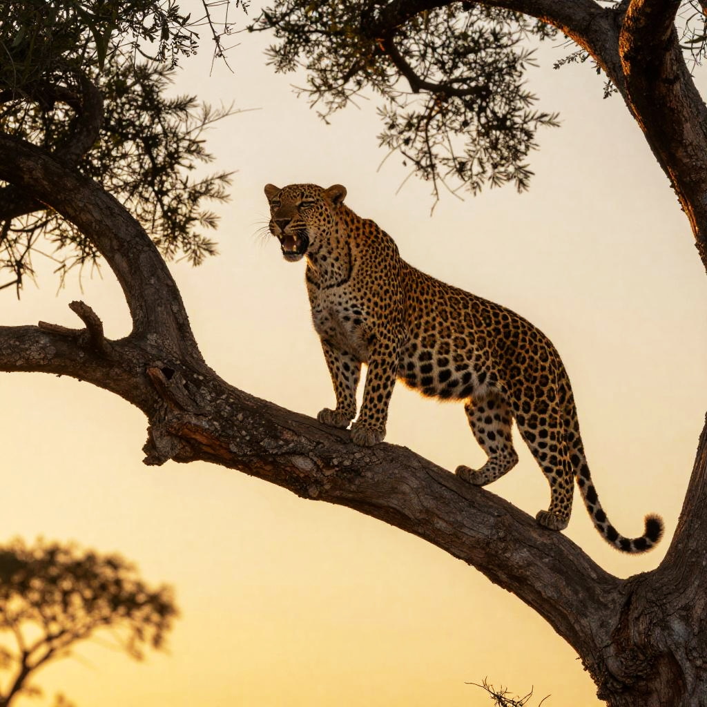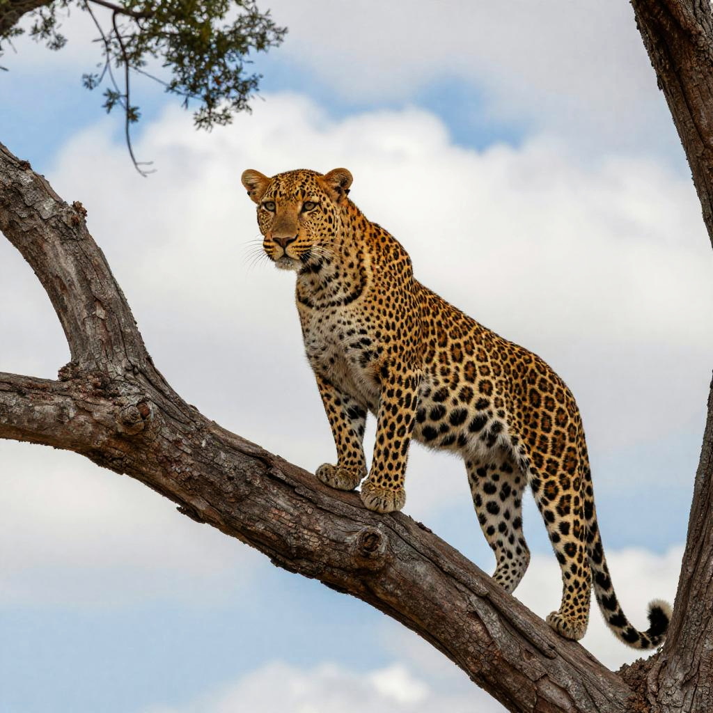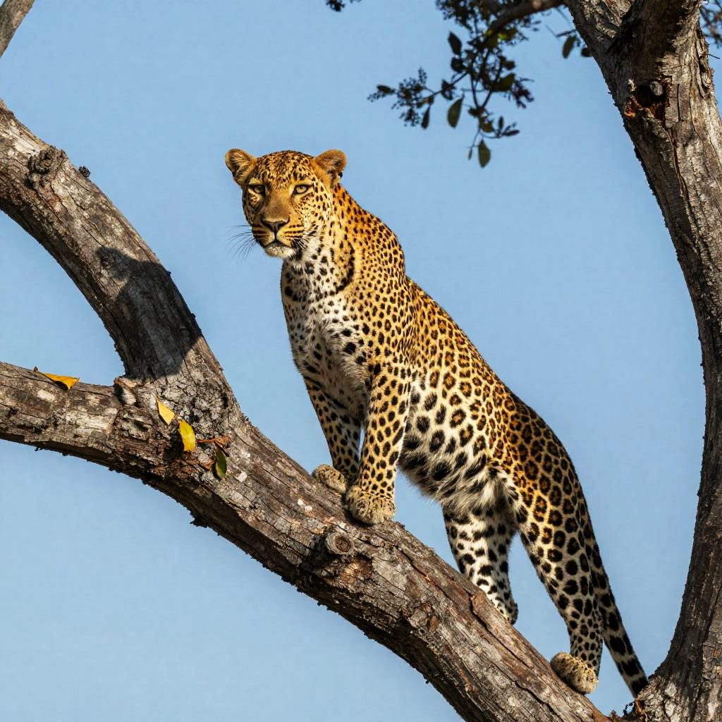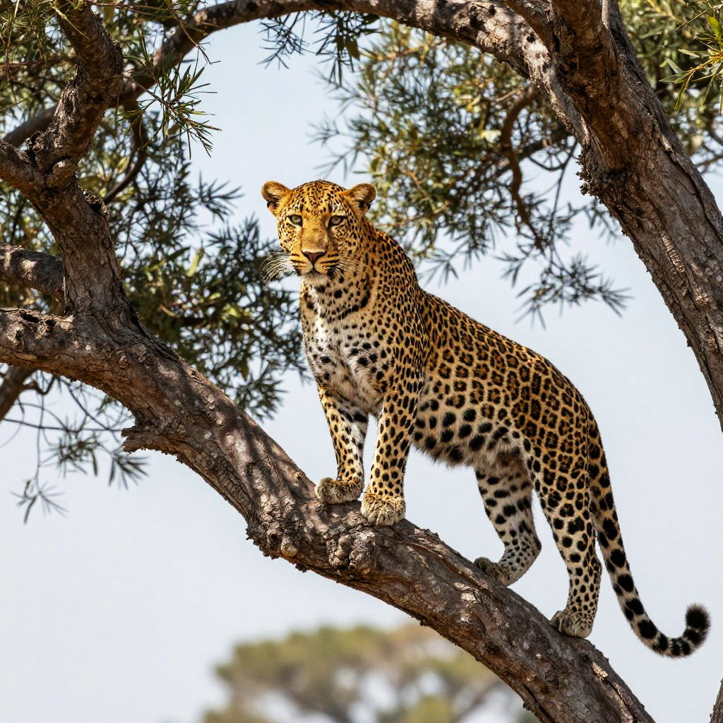 A high-quality photograph of a leopard perched on a large, gnarled tree branch. The leopard's golden coat with black rosettes stands out against the bright midday sky. The tree's rough, textured bark is prominently featured in the foreground, with dense canopy leaves surrounding the branch. The leopard's snarling, teeth-bared expression adds ferocity.