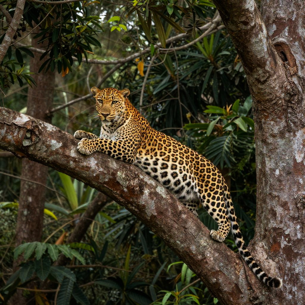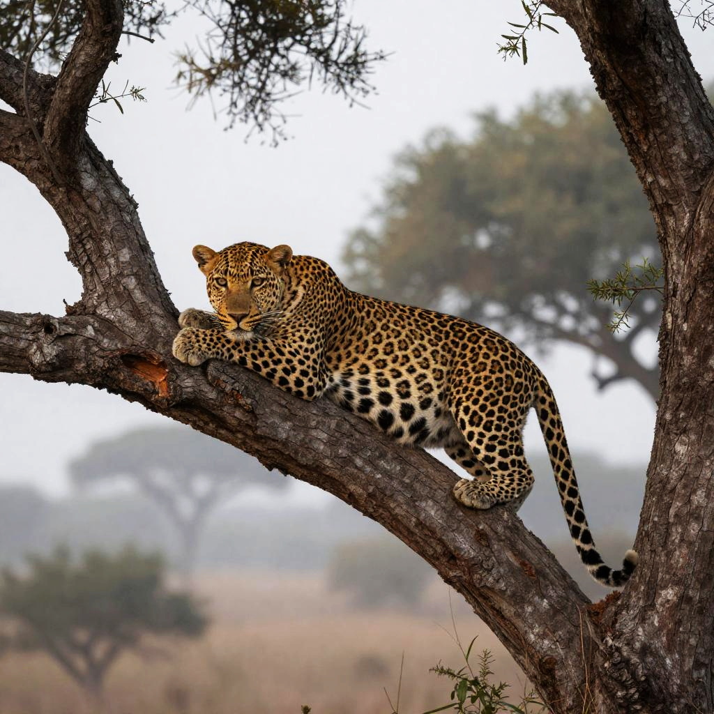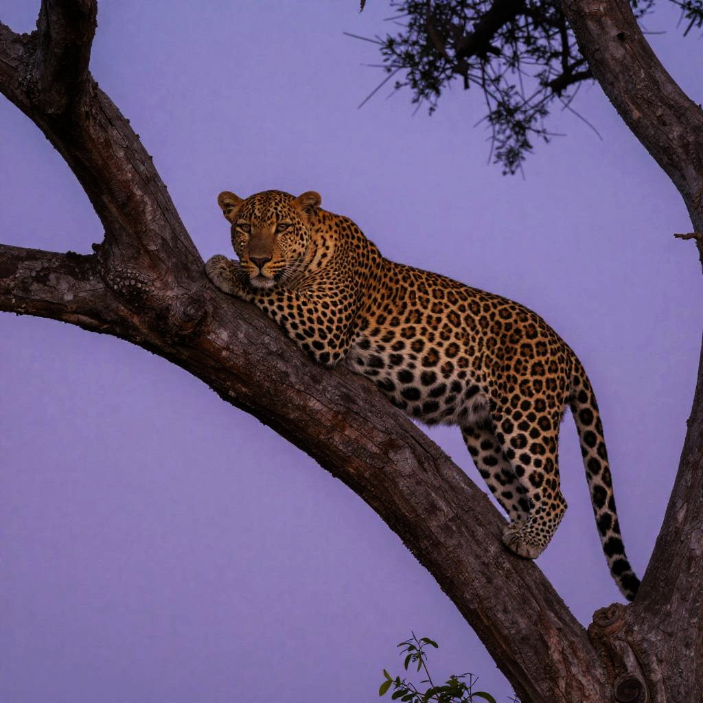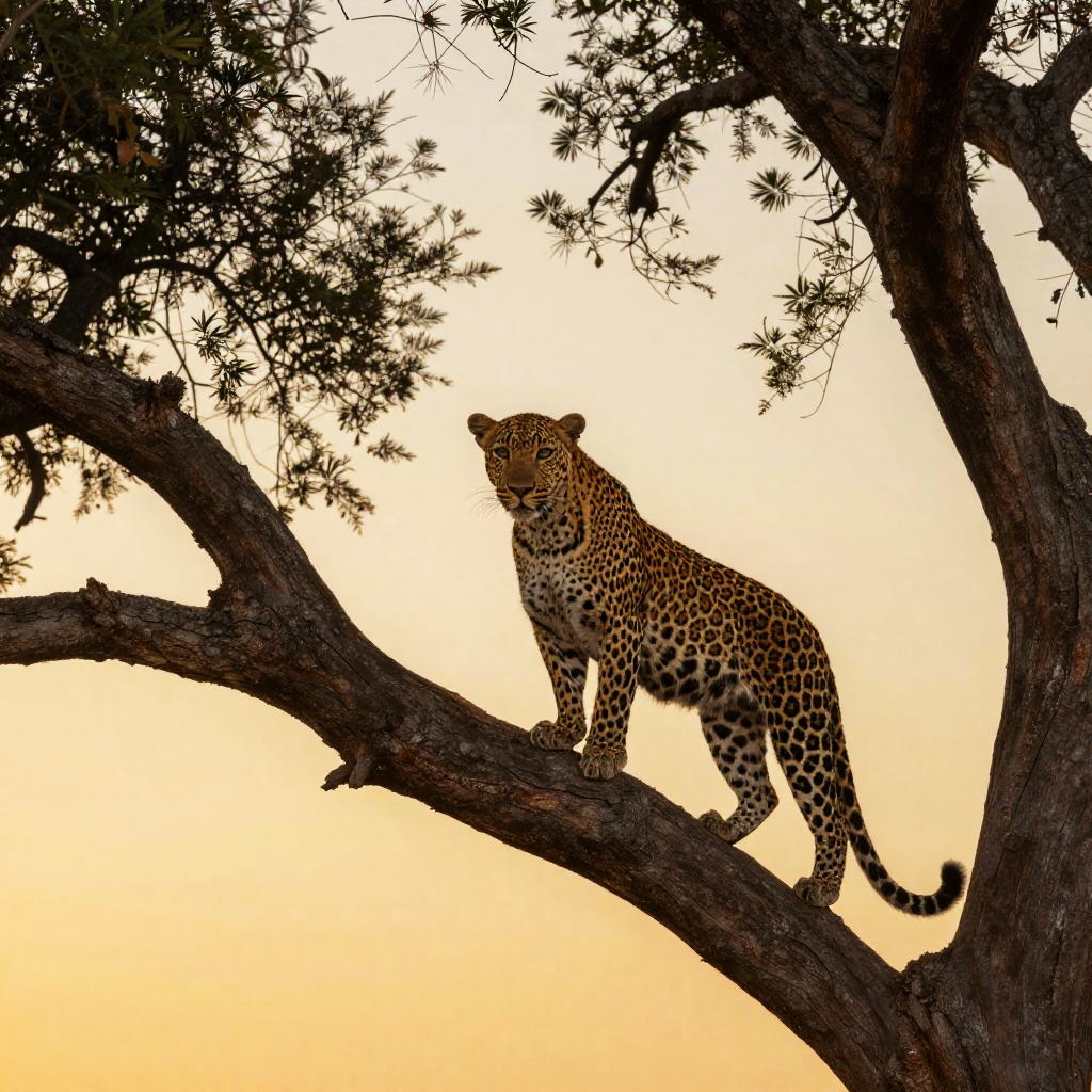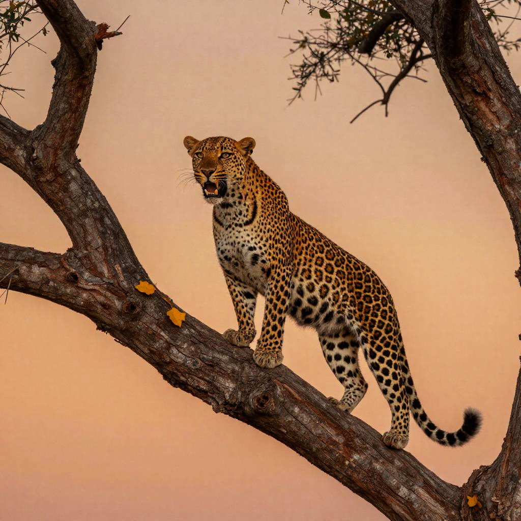 A high-quality photograph of a leopard perched on a large, gnarled tree branch. The leopard's golden coat with black rosettes stands out against the bright midday sky. The tree's rough, textured bark is prominently featured in the foreground, with dense canopy leaves surrounding the branch. The leopard's snarling, teeth-bared expression adds ferocity.