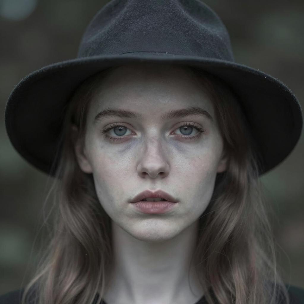 Portrait of a young woman with light skin and brown braided hair, wearing a light beige button-up safari shirt with short sleeves and two front pockets. She has a serious expression and wears a large tan wide-brimmed hat. The background is blue-grey with studio lighting highlighting her casual attire in a realistic style.