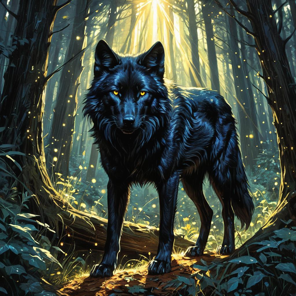 Highly detailed digital art of a black fox with luminous golden eyes standing in a magical enchanted forest. Surrounding the fox are glowing fairies and radiant particles, with rays of light filtering through tall trees in the background. The scene showcases a mystical atmosphere with dark and light contrasts, emphasizing the fox as the central subject. Inspired by concept art styles.