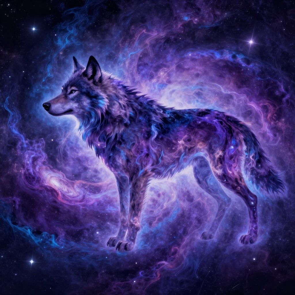 Digital artwork of a glowing, ethereal wolf with vibrant blue, purple, and pink cosmic fur against a starry space background.