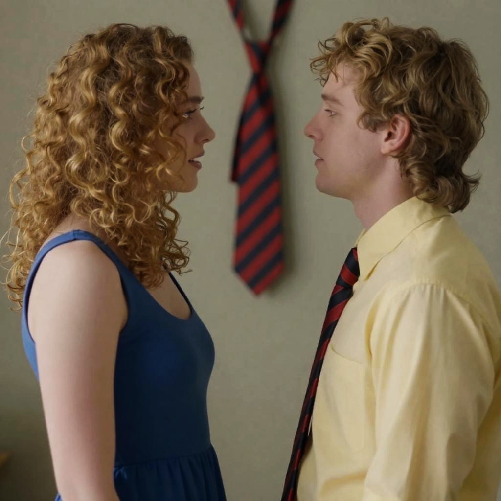 Photograph of a young couple. Woman with curly blonde hair, blue dress, looking down at man with wavy blonde hair, yellow shirt, looking up at her. Red and black striped tie in background. Intimate, focused expressions. Both close to center.