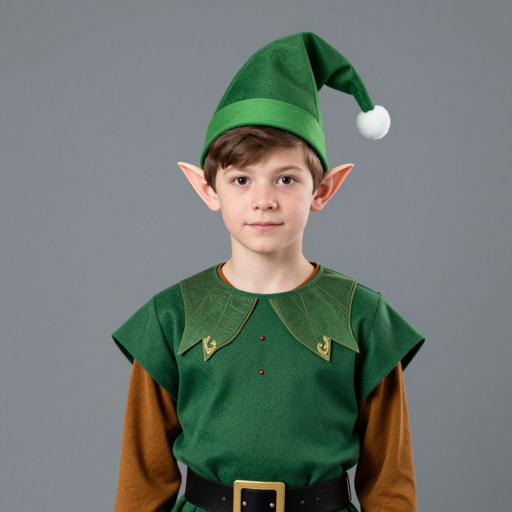 Photograph of a young boy with pale skin, brown hair, and pointed elf ears, wearing a green elf costume with a hat, brown long sleeves