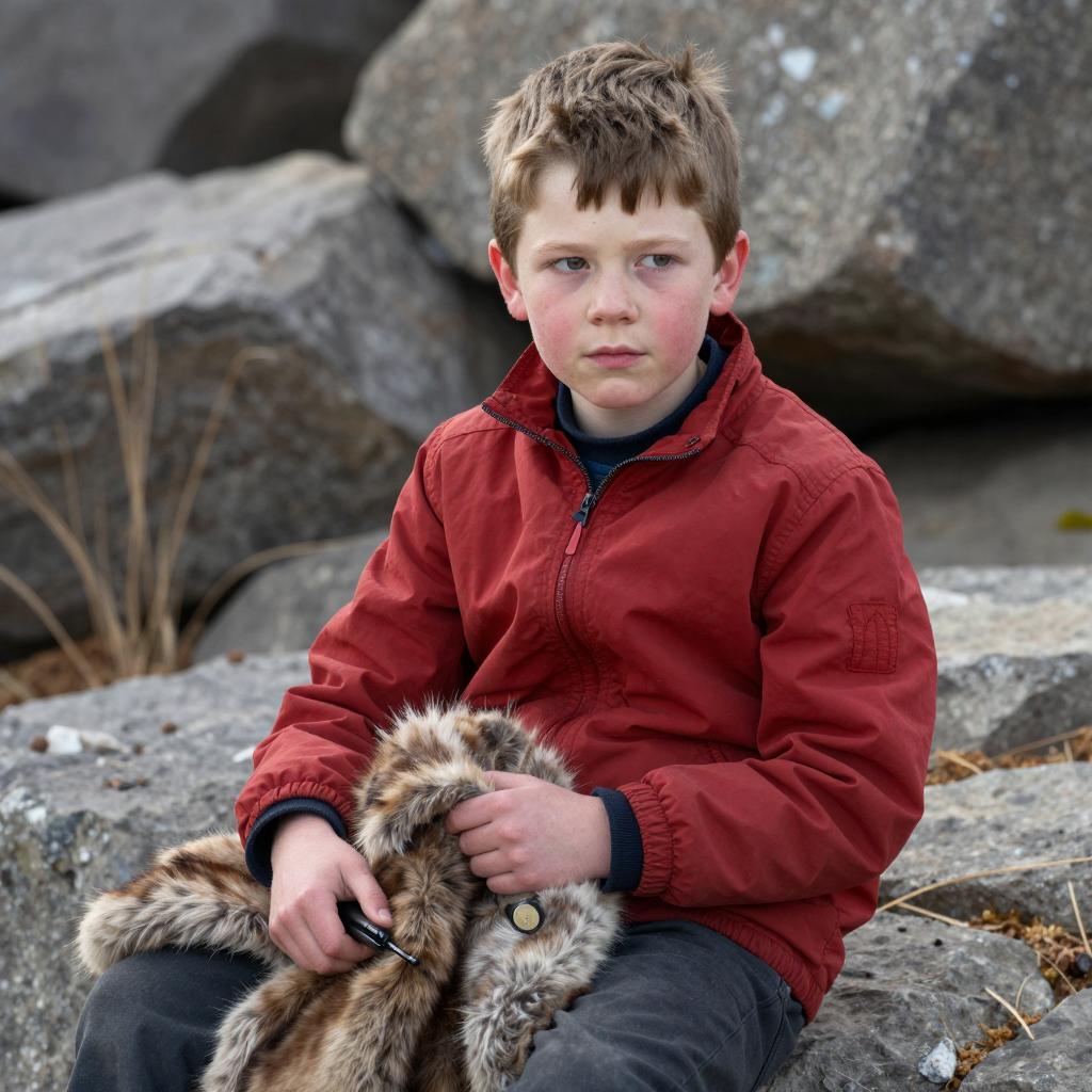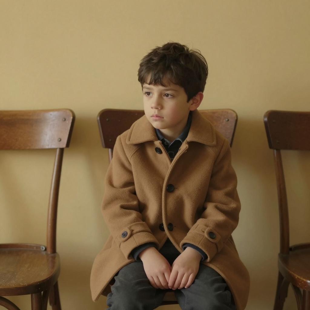 An older man with short, dark hair holding a cigarette to his mouth, and a young boy with brown hair hugging him from behind. The man wears a white shirt with a blue plaid vest, the boy wears a white shirt and blue plaid vest. Background includes blurred green trees and a light-colored car. The boy's expression is slightly worried, the man's expression is serious. The man's left arm is around the boy's chest, the boy's arms are wrapped around the man's neck. Two people.