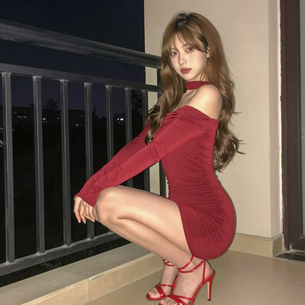 Woman with long brown hair, red off-shoulder dress, and red strappy high heels, crouching on a balcony at night. Her right leg is bent, left leg is forward. Her right hand is on the ground, left hand resting on her knee. Black metal railing and white wall in background. Light source from the right.