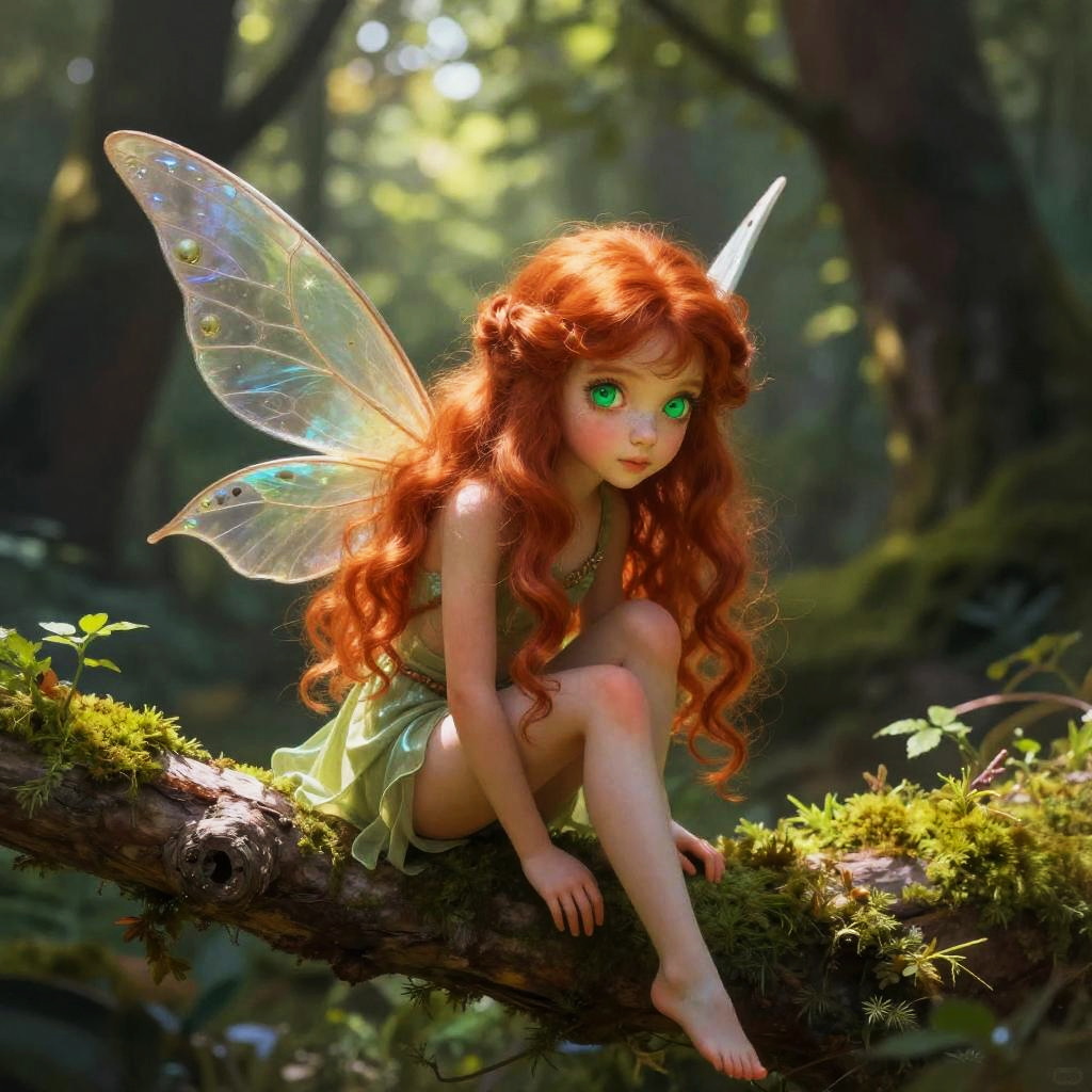 Red hair green eyes whimsical forest fairy with delicate wings perched on a mossy branch, dappled sunlight, vibrant colors, magical atmosphere, digital painting
