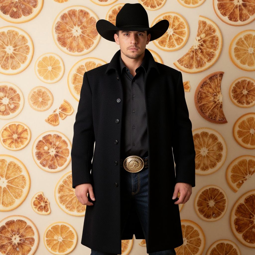 A man dressed in an elegant black cowboy outfit, including a wide-brimmed cowboy hat, a dark long coat with button details, dark shirt, jeans, and a belt with a large decorative buckle. The background features an artistic pattern of circular slices resembling dried citrus fruits on a light wall.