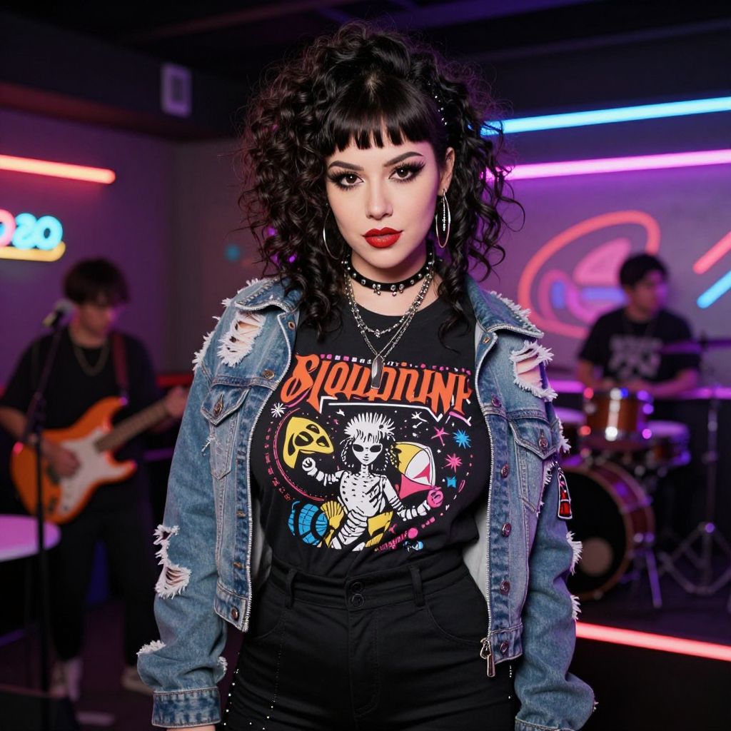 A bold, mid-20s woman with thick curly bangs and a messy, trendy undercut hairstyle stands in a retro 80s music venue, wearing a punk-style costume with a ripped jacket, band t-shirt, and high-waisted black pants, her face has sharp cheekbones and expressive dark eyes, the room is filled with neon lights and live band energy.. The woman has big tits and cute face