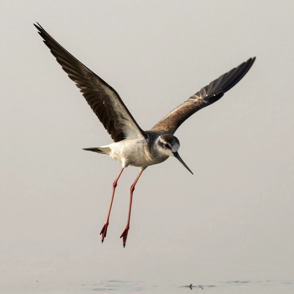 No humans, solo stilt sandpiper, in shallow coastal lagoon, animal focus, full body in frame, wings fully spread, talons visible, mid-flight, looking at viewer, sparkling catchlights, detailed feather texture, crisp beak edges, dramatic contrast, subtle atmospheric haze, balanced natural colors, ultra detailed, clean silhouette, zero noise, clean detailed natural photography with soft pastel sky