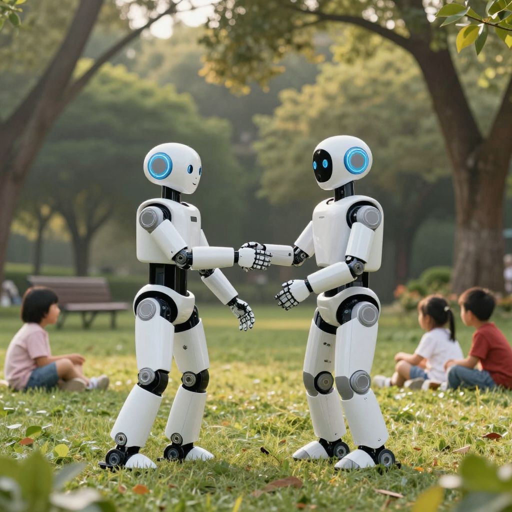 Photograph of two white, humanoid robots with blue circular eyes and black joints standing in a sunlit park. They are shaking hands in the center, surrounded by green grass and trees. In the blurred background, four people—two women and two children—sit on a wooden bench, some wearing casual clothes. The park has a serene atmosphere with dappled sunlight filtering through the leaves. The robots have a sleek, modern design with metallic textures, contrasting with the natural park setting.