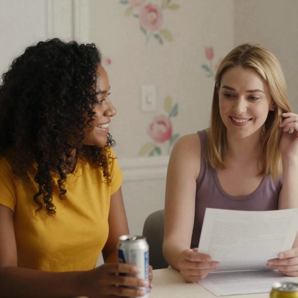 Black and white photograph of two women on a metal structure. Left woman with glasses drinks from a can, dark hair, light shirt. Right woman with blonde hair in a bun, plaid shirt, looks down. Metal beams in background. Left woman's expression is focused, right woman's expression is neutral. Both women have fair skin.