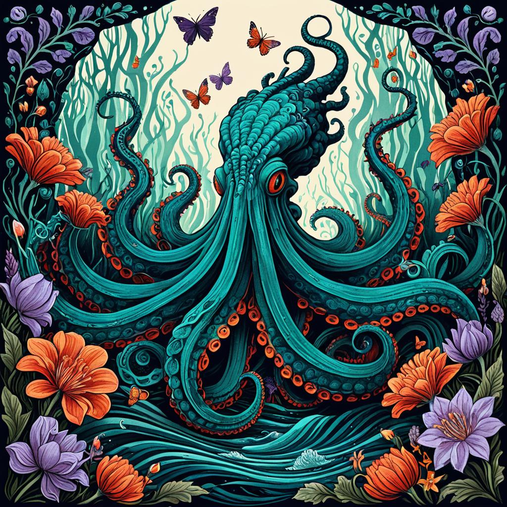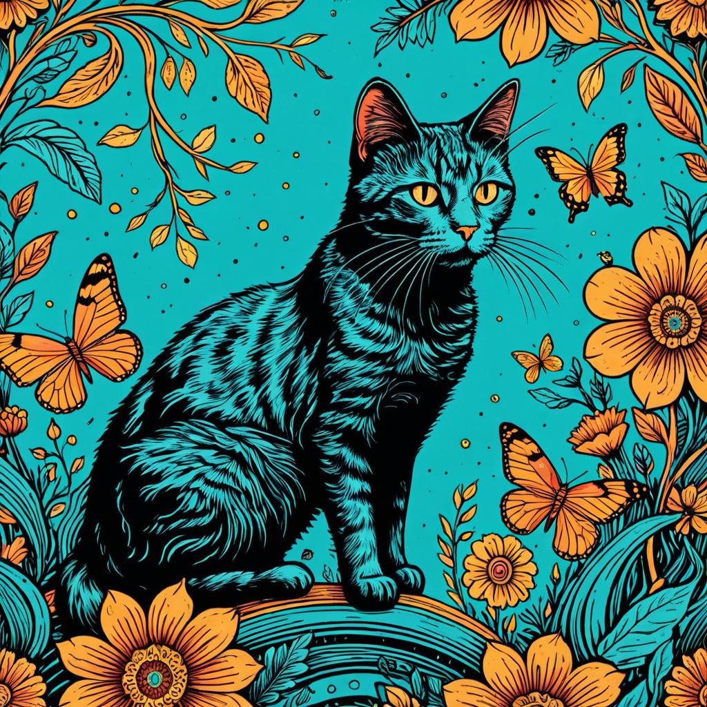 Chameleon portrayed with fantastical surreal aesthetics, featuring organic, flowing forms and vibrant, saturated colors. The composition blends realistic and stylized motifs, incorporating elements like flowers, leaves, and butterflies. Clean, precise line work adds structure, while dreamlike movement and fluidity create a rich, immersive scene. The color palette includes rich colors - lime green, electric blue, and sunset orange