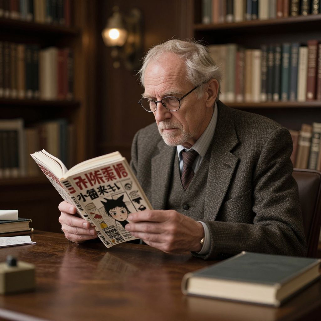 Photograph of an elderly white man with thinning gray hair and a beard, wearing glasses, a dark brown tweed suit, white shirt, and blue tie, sitting at a wooden desk in a dimly lit library. He is intently reading a Japanese magazine with bold red and black text and a cartoon illustration. The background features tall bookshelves filled with books. The desk has a few stacked books and a closed notebook. Warm, ambient lighting from a wall sconce creates a focused, scholarly atmosphere.