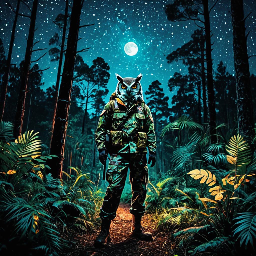Forest witch with herbs, in the forest at night with high trees, teal moon, and an owl, colorful art