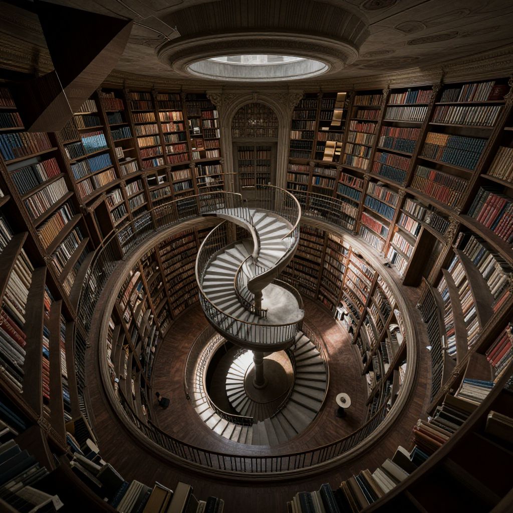 Photograph of a grand, circular library with a spiral staircase, shelves filled with colorful books, and a central skylight illuminating the space.