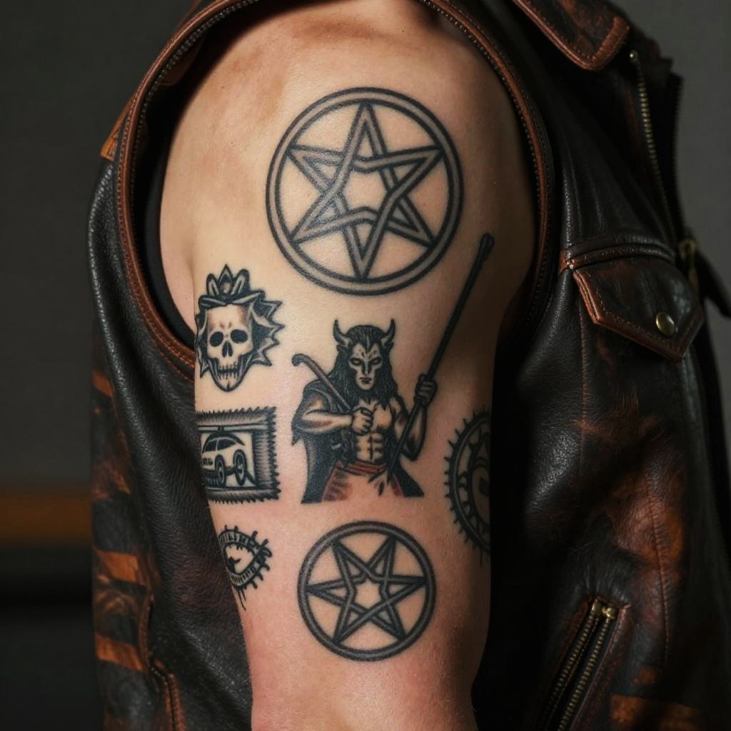 Photograph of a tattooed arm in a brown leather sleeve, featuring black pentagrams, a horned demon with a staff, a skull, and
