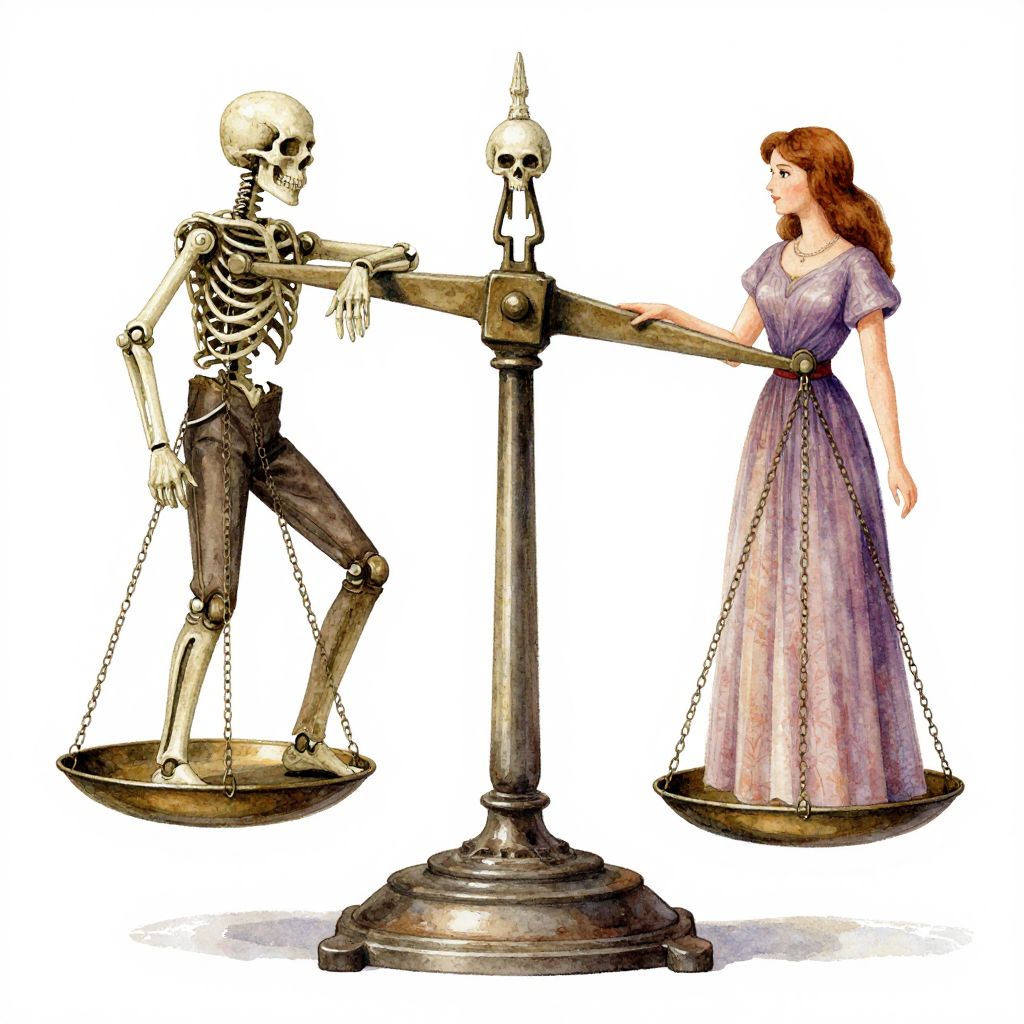 "Skull a set of antique scales balancing a man on one side and a woman on the other side, water colour style,"