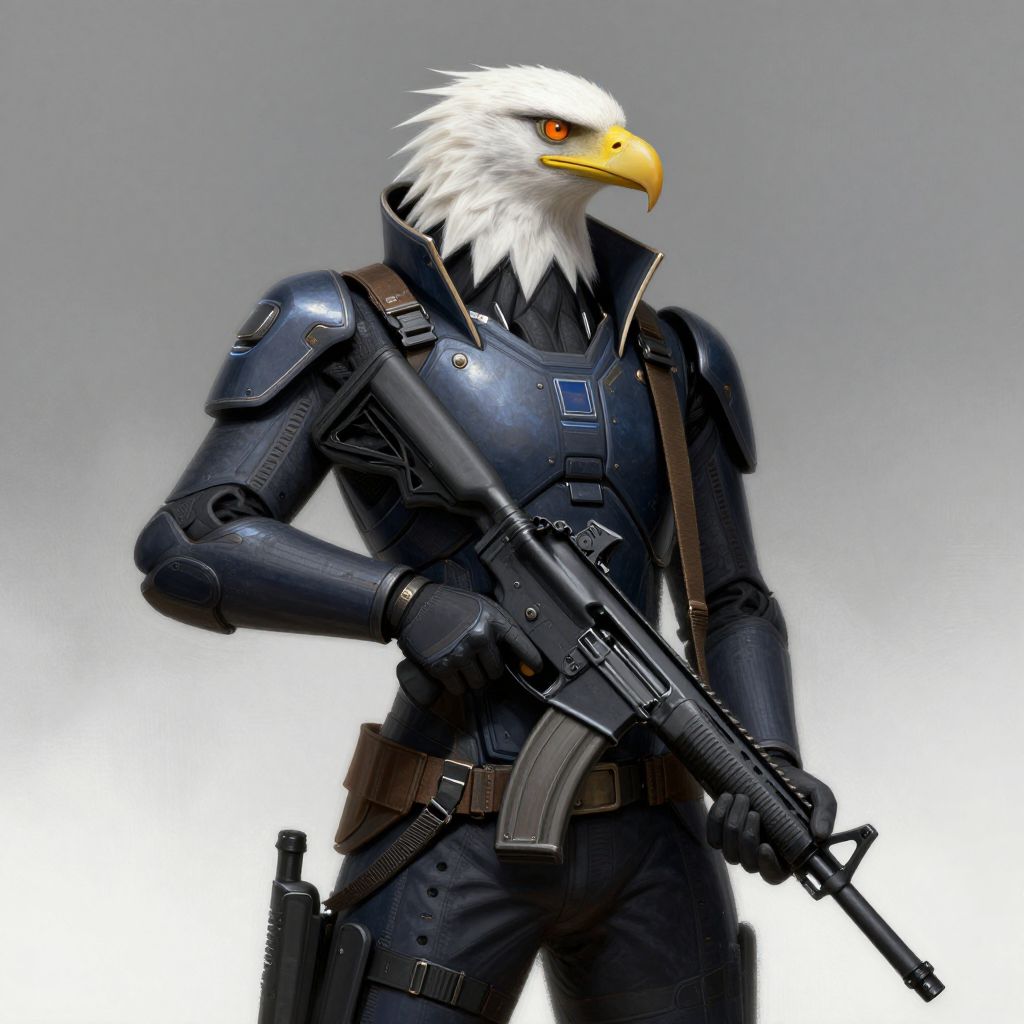 Digital art of an anthropomorphic bald eagle in dark, shiny armored suit holding a rifle, with intense red eyes, against a gradient gray background.