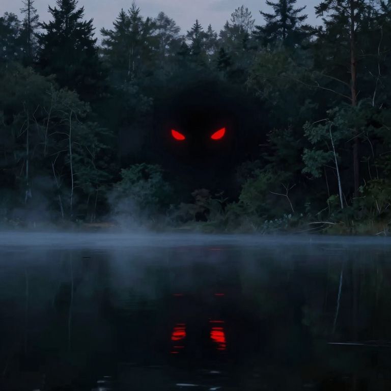 Photograph of a dark, dense forest at dusk, with tall pine trees visible in the background. A mysterious, black figure with glowing, red eyes is centered in the trees, its eyes reflecting vividly on the still, mist-covered lake in the foreground. The water is calm, mirroring the dark forest and the eerie red eyes. The sky is overcast, adding to the eerie, atmospheric mood. The red eyes are the only bright color, contrasting sharply with the dark, muted tones of the forest and water.
