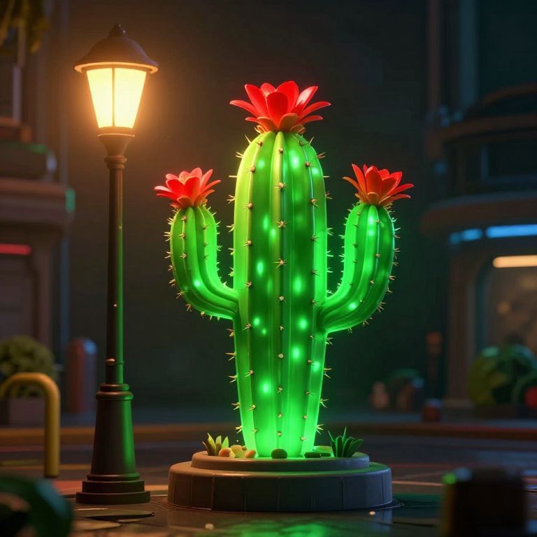 Photorealistic digital artwork of a glowing green cactus with red flowers illuminated by a vintage street lamp at night.