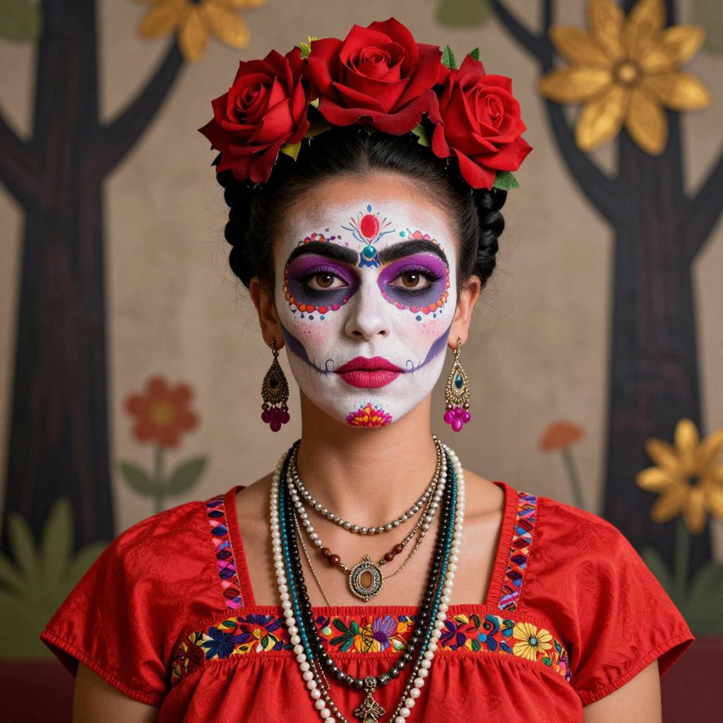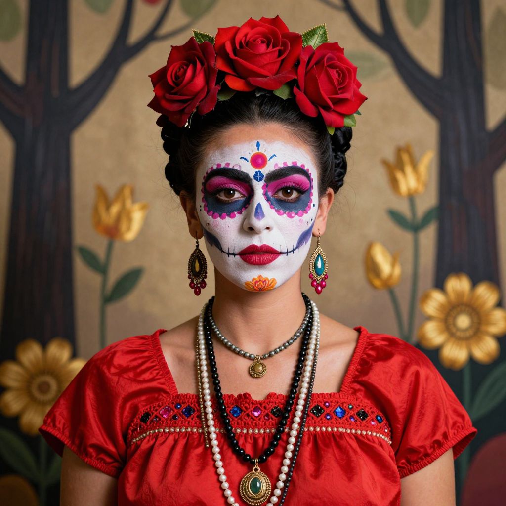 Frida Kahlo-inspired portrait featuring a woman adorned with vibrant Day of the Dead makeup, a striking red rose crown, dangling earrings, layered necklaces, and a traditional red blouse against a backdrop of stylized trees and golden flowers.