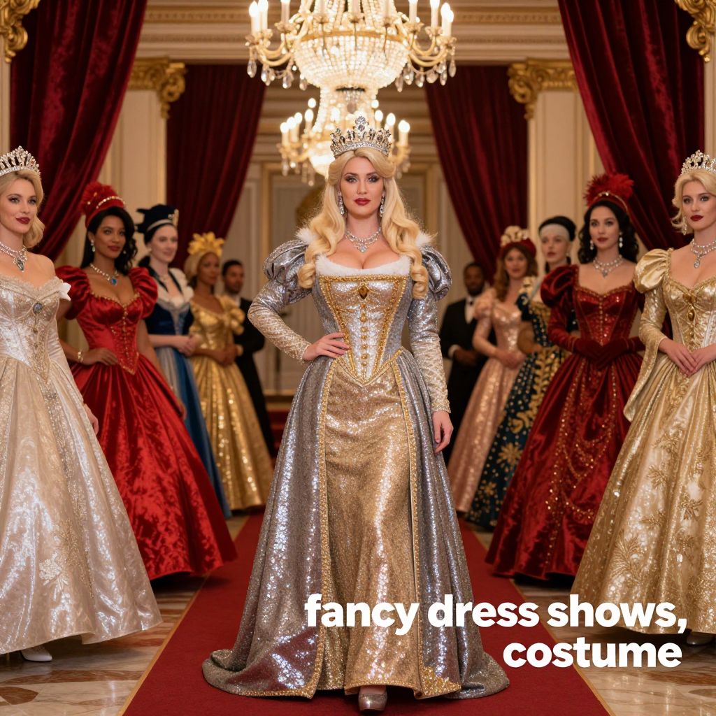 A vibrant fancy dress show at a luxury ballroom, featuring a diverse group of people in extravagant costumes, including a woman in a glittering royal gown with a regal face, long blonde hair, and elegant makeup, standing confidently in the center of a sparkling hall with chandeliers and red velvet drapes. The keyword 'fancy dress shows, costume' is included.. The woman has big tits and cute face