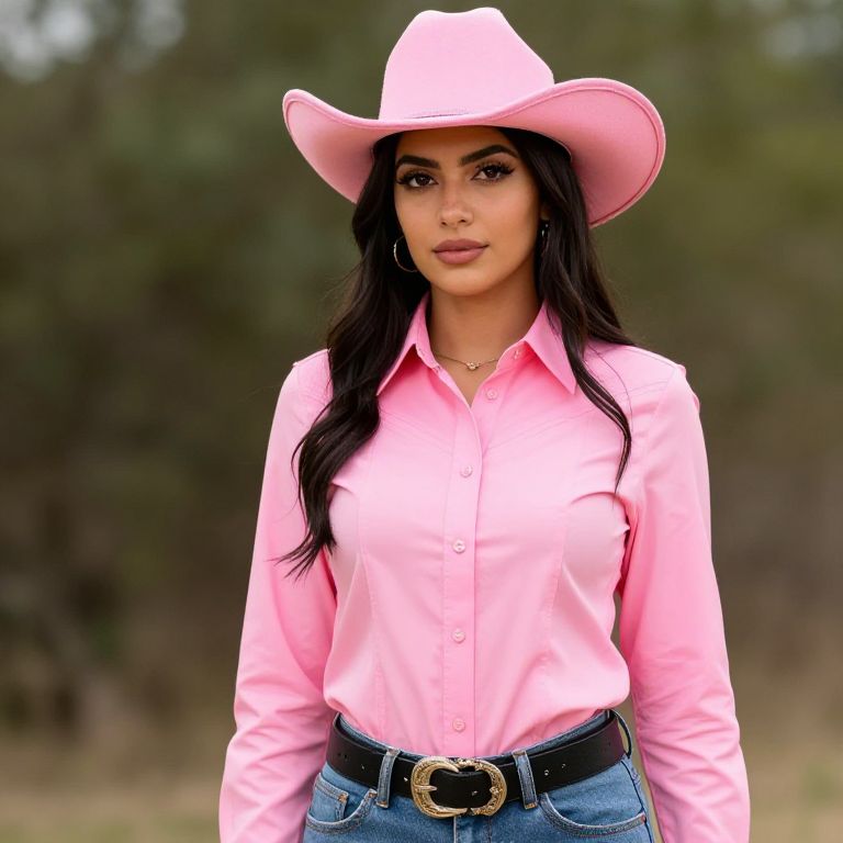 Female wearing a pink cowboy outfit with a pink hat and a pink shirt with a black belt.