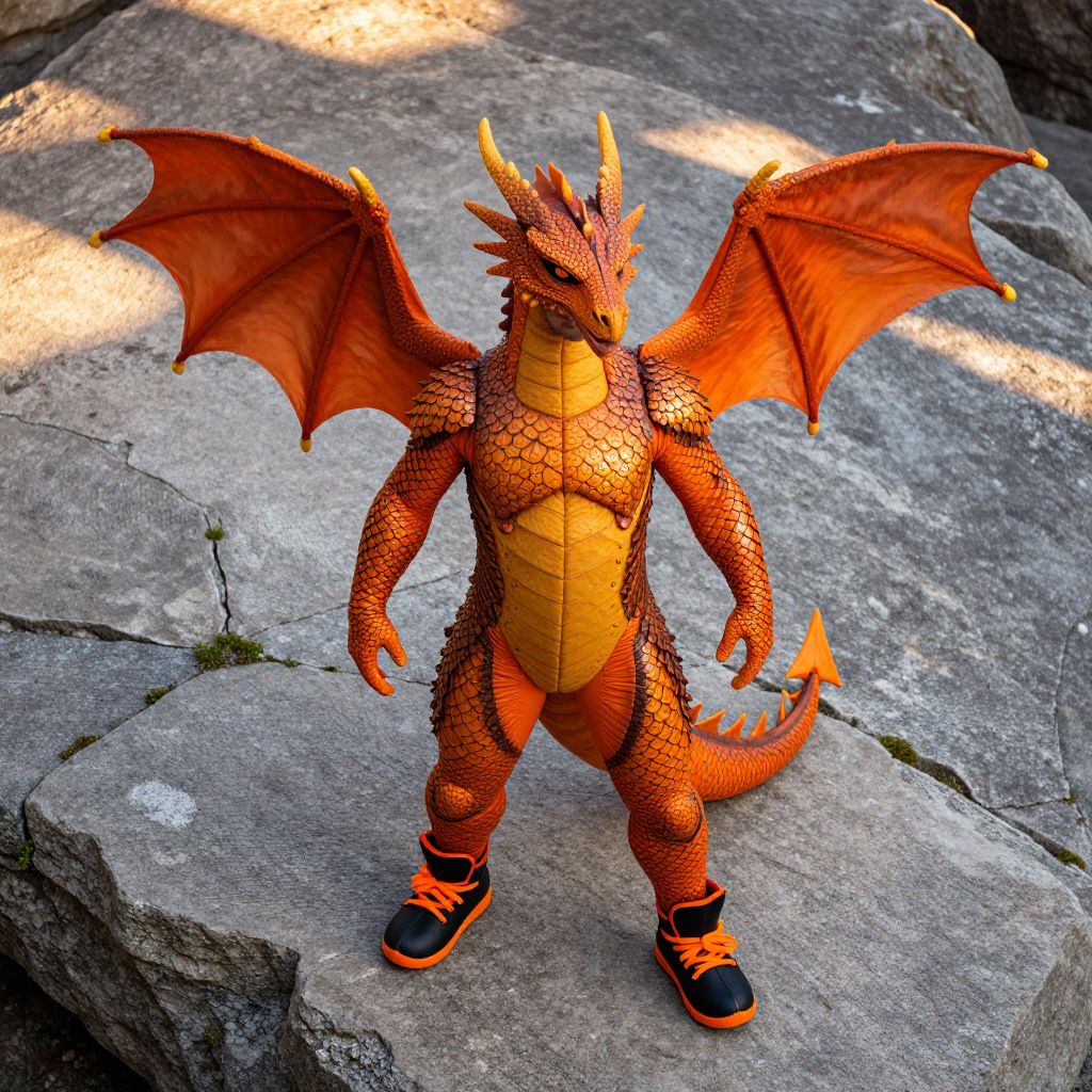 Photograph of a detailed, orange-scaled, dragon figure standing on a large, gray rock. The dragon has pronounced wings, sharp horns, and a yellow underbelly. It wears black and orange sneakers. The texture of the dragon's scales is highly detailed, resembling a realistic reptilian skin. Sunlight casts shadows on the rock, highlighting its rough texture. The dragon's tail curls slightly to the right, and its wings are spread wide, filling the upper part of the image. The overall style is highly realistic for a toy or figure.