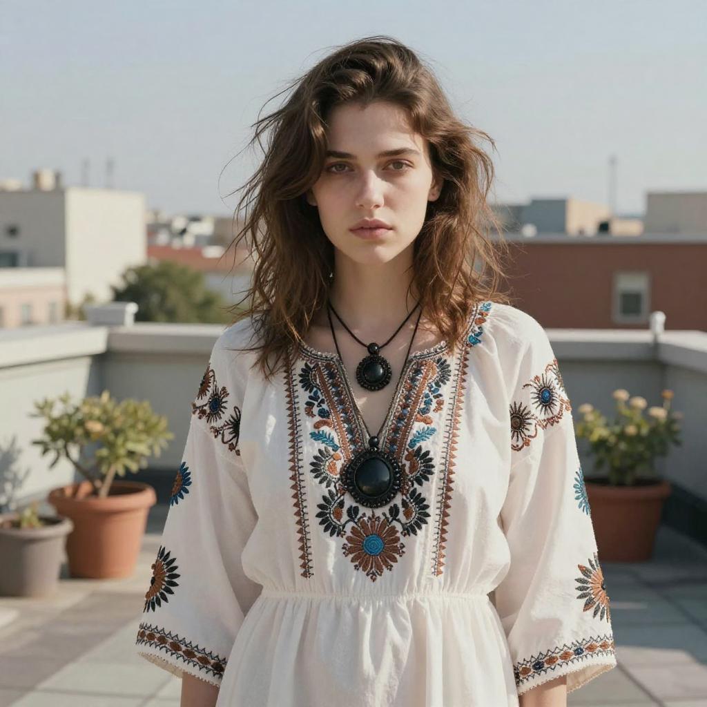 Photograph of a young woman with messy, shoulder-length brown hair and pale skin, standing on a rooftop. She's wearing a loose, white, embroidered dress with intricate patterns in brown, black, and blue, and a chunky black necklace with a large pendant. The background shows a sunny, urban skyline with blurred buildings and potted plants. Her expression is serious and slightly pensive.