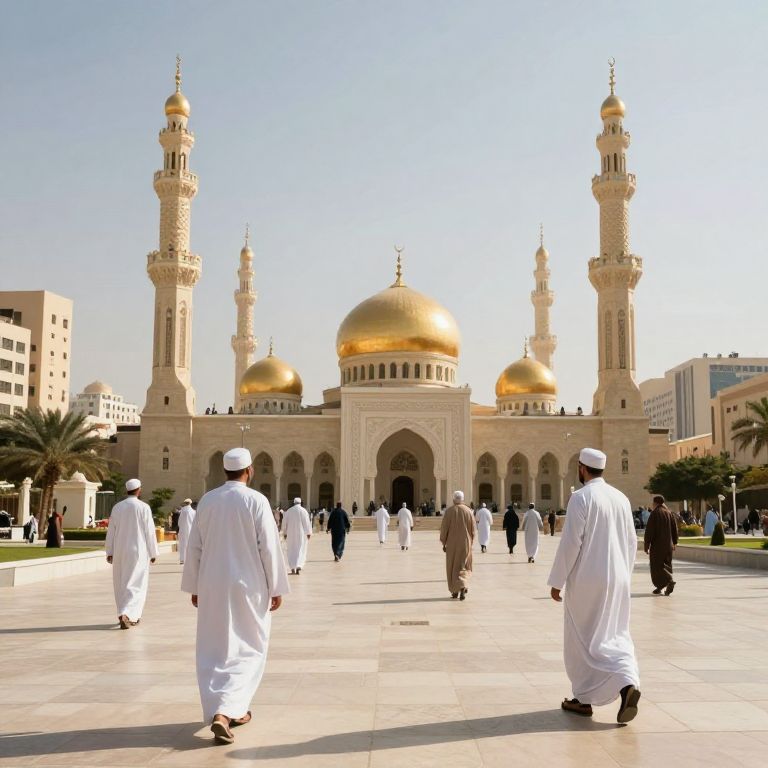 Prompt Islamic: A modern Islamic-inspired urban scene with minarets, flowing white robes, a central mosque with golden domes, sunlight casting long shadows, peaceful atmosphere, harmonious fusion of tradition and contemporary city life, warm earth tones, balanced composition.