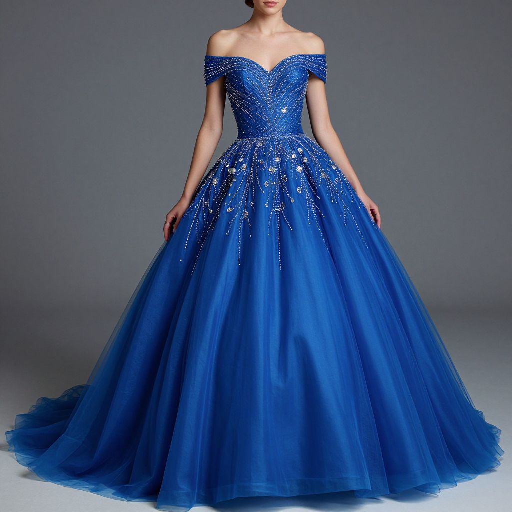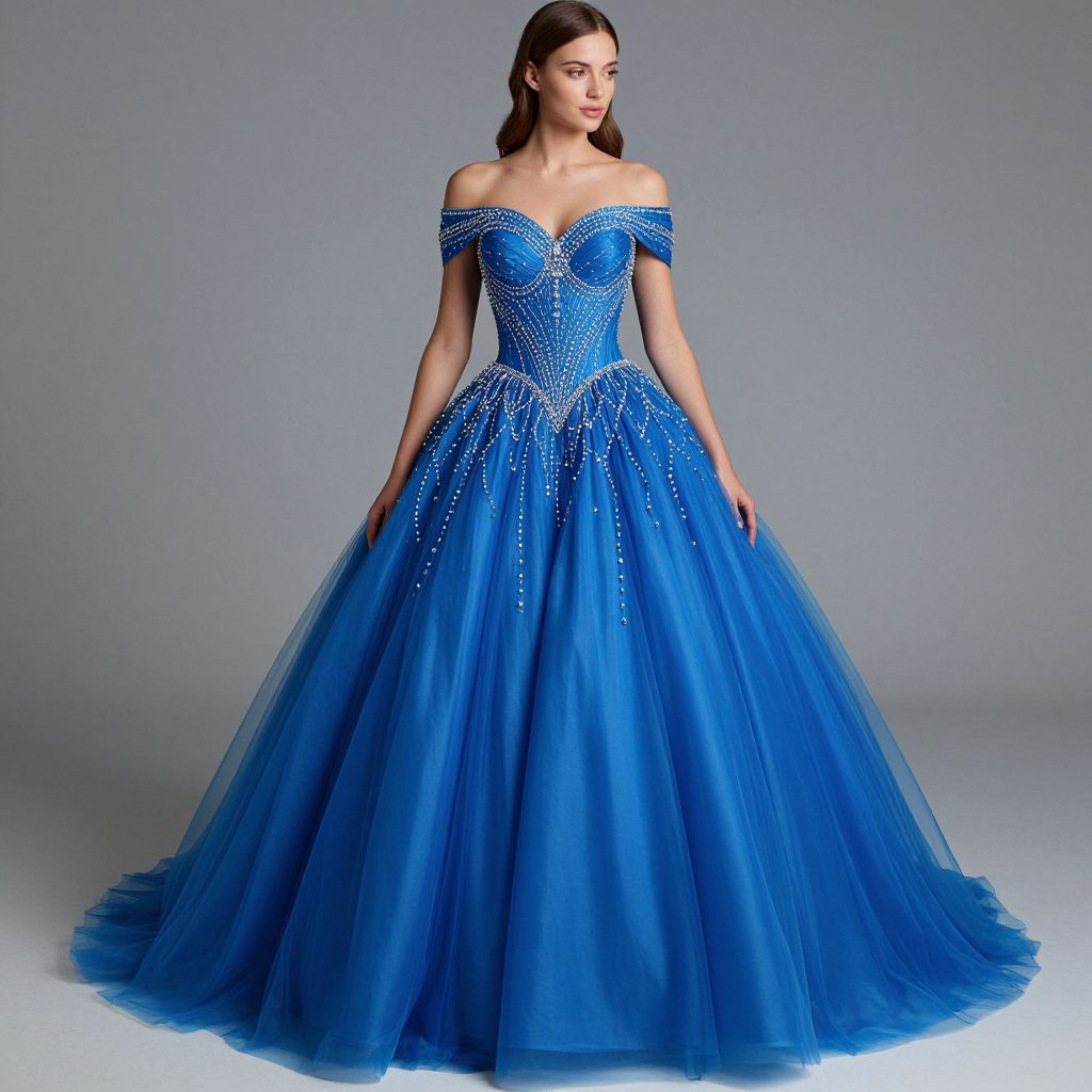 Elegant woman showcasing a vibrant blue off-shoulder ball gown adorned with sparkling handmade beads, featuring a flowing tulle skirt and a fitted bodice embellished with intricate detailing.