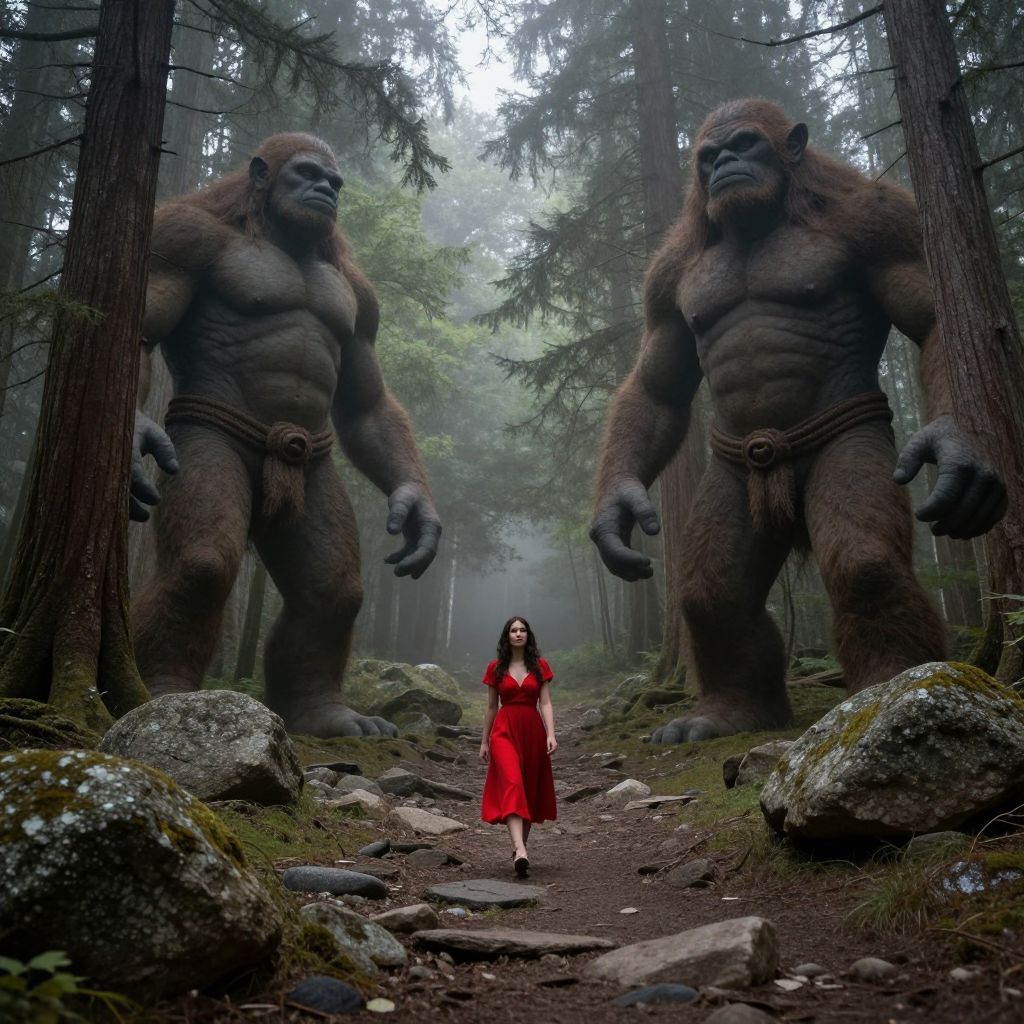 Trolls stand guard in a misty forest, their muscular forms towering over a lone woman in a vibrant red dress who walks down a rocky path, flanked by towering trees and scattered boulders.