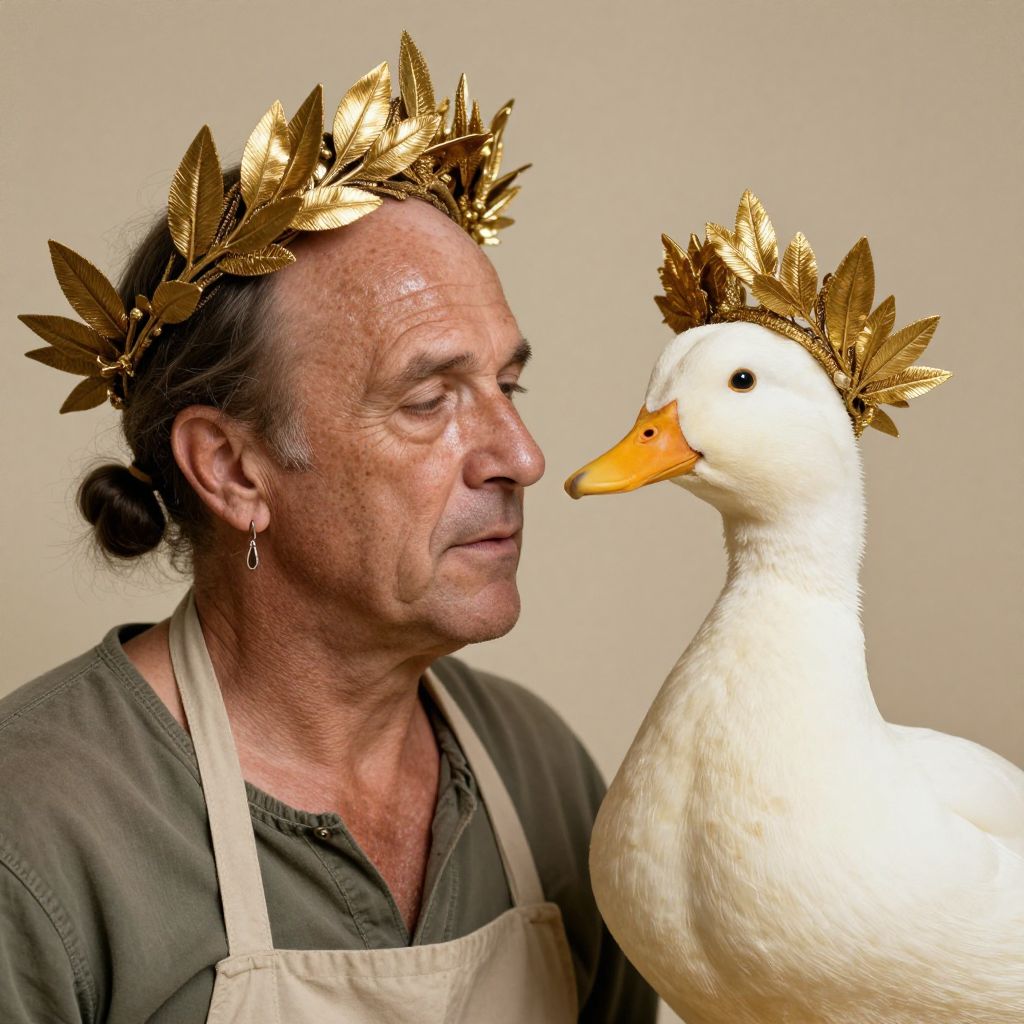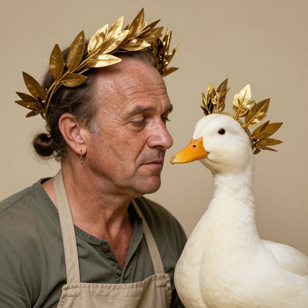 A hi-res, photographic composition, A middle-aged man with a rugged, weathered face, detailed wrinkles, freckles, and skin texture, His hair is styled with two small buns on the sides, leaving the top bald and shiny, He wears a casual green shirt and a worn beige apron, hinting at his labor background, A single earring dangles from his ear, On his head, he wears a grand Roman-style golden laurel wreath, its intricately crafted leaves gleaming softly, adding an imperial yet playful touch to his modest appearance, To the right, a white duck with fluffy feathers and a bright orange beak stands prominently, The duck also wears a regal golden laurel wreath, carefully detailed to fit its head, blending whimsy with grandeur, The duck's calm, curious gaze is positioned close to the man, creating a surreal yet harmonious balance, The background is a soft beige with a lightly distressed texture, enhancing the vintage aesthetic, Soft, warm lighting highlights the golden laurel wreaths, the man’s rugged features, and the duck’s pristine feathers, adding a touch of majesty and humor to the scene