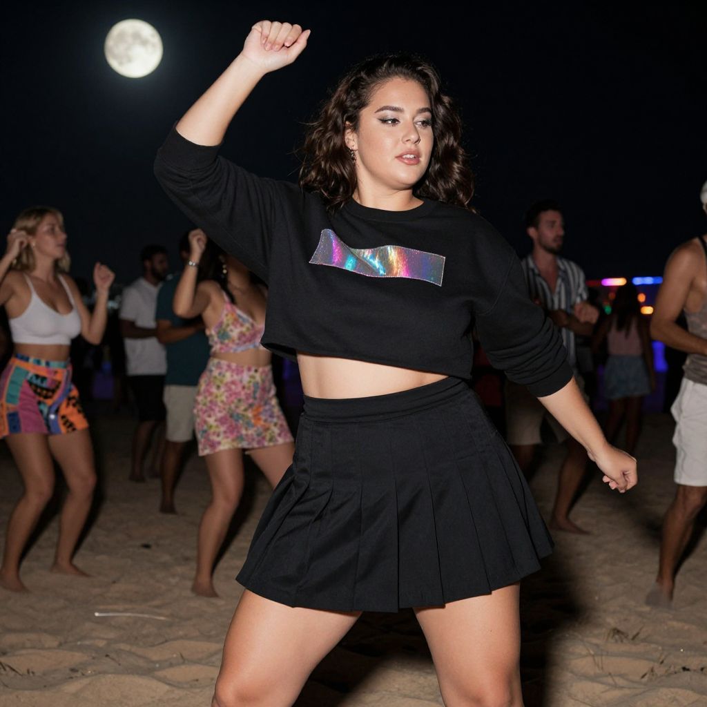 A Plus-size woman in a cropped black sweatshirt with an iridescent panel and a high-waisted black pleated mini skirt, captured in a hand-tinted photograph, is enjoying a Moonlight dance party on the beach, swaying to the music under the stars. Sexy. Pretty face and beаutiful eyes. Big breasts