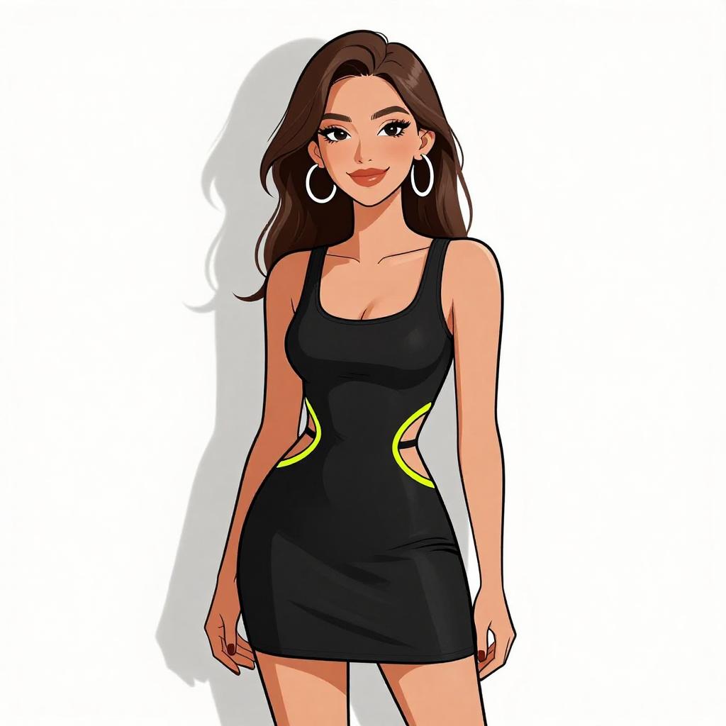 Digital illustration of a confident woman with light brown skin and long, wavy dark brown hair. She wears a form-fitting, sleeveless green dress with a high slit on the left side and black high-heeled sandals. Over the dress, she has a black, oversized jacket that is slightly off her shoulders. She has large, hoop earrings, and a bright smile. The background is plain white, making her the focal point. The illustration style is modern and vibrant, with bold colors and clean lines.