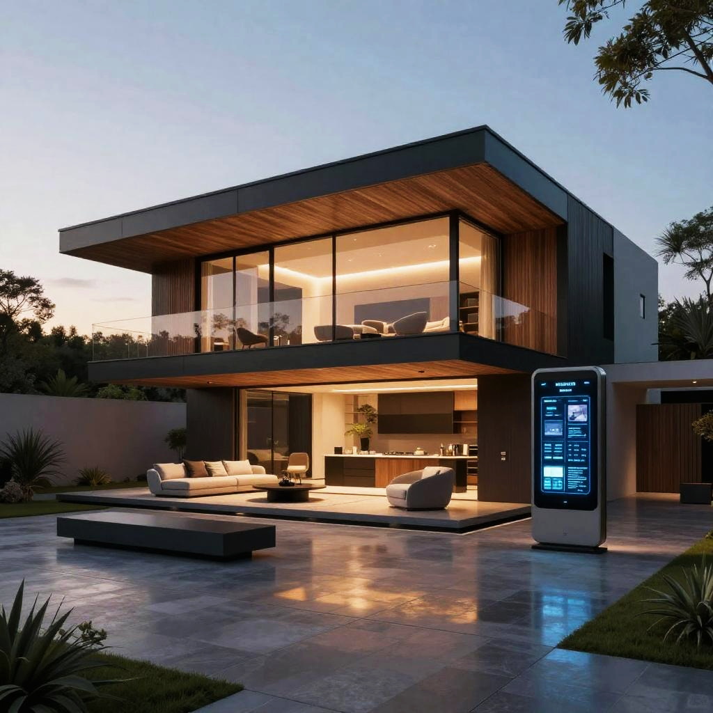 Modern, two-story house at dusk with illuminated interior, glass balcony, wooden accents, outdoor seating area, and a smart home control panel.
