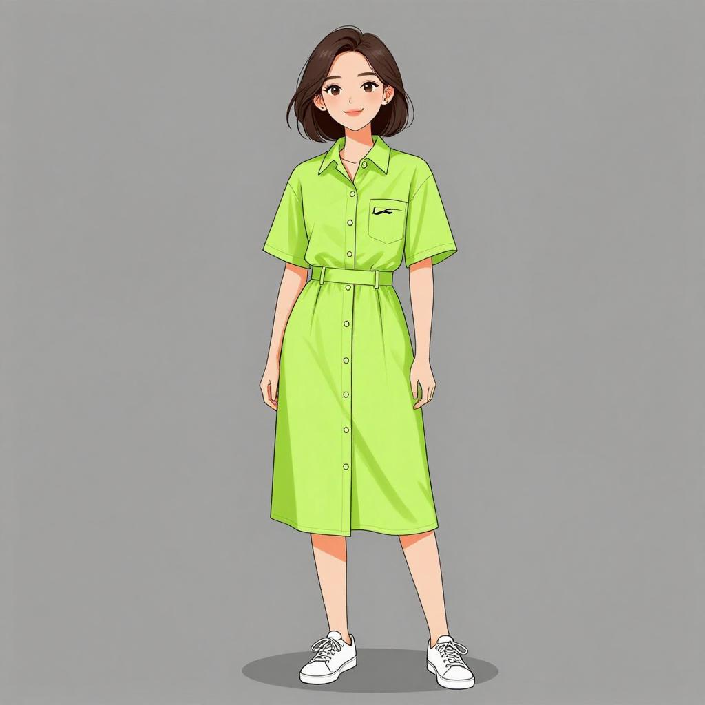 This digital anime-style drawing depicts a young woman with fair skin and short, straight, dark brown hair. She has a slender build and is wearing a bright lime green, short-sleeved, button-up dress that reaches mid-calf. The dress has a pocket on the left side and is cinched at the waist with a matching belt. She pairs the dress with white sneakers. She stands against a plain, light gray background with a slight shadow beneath her feet. Her expression is neutral, with a slight smile, and she has small, black eyes and a small nose.