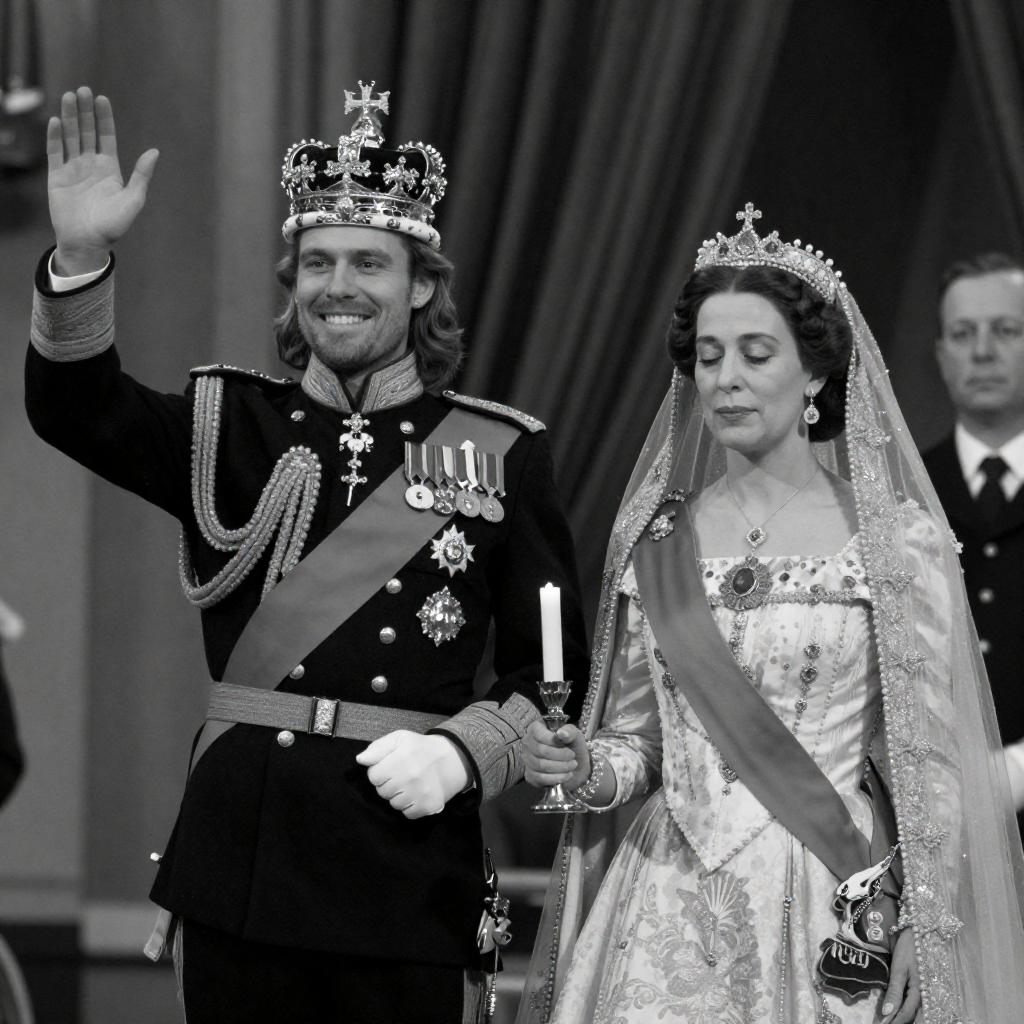 Black-and-white photograph of a regal scene. King with long hair, ornate crown, and military uniform with medals, smiling. Queen with large, glittering headdress, veil, and ornate dress, eyes closed. King holds candle, Queen's right side. Background: dark, draped fabric. Two people, King on left, Queen on right. King's left arm raised, Queen's left arm down. Intense, respectful expressions.