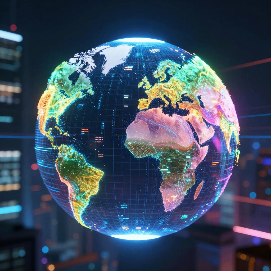 AI video generator stable diffusion visualized as a digital wave spreading across a globe, vibrant neon colors blending smoothly into one another, detailed data points and grids, futuristic cityscape background, ethereal light trails, high definition, contemporary digital art style