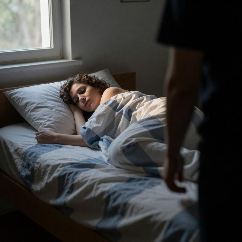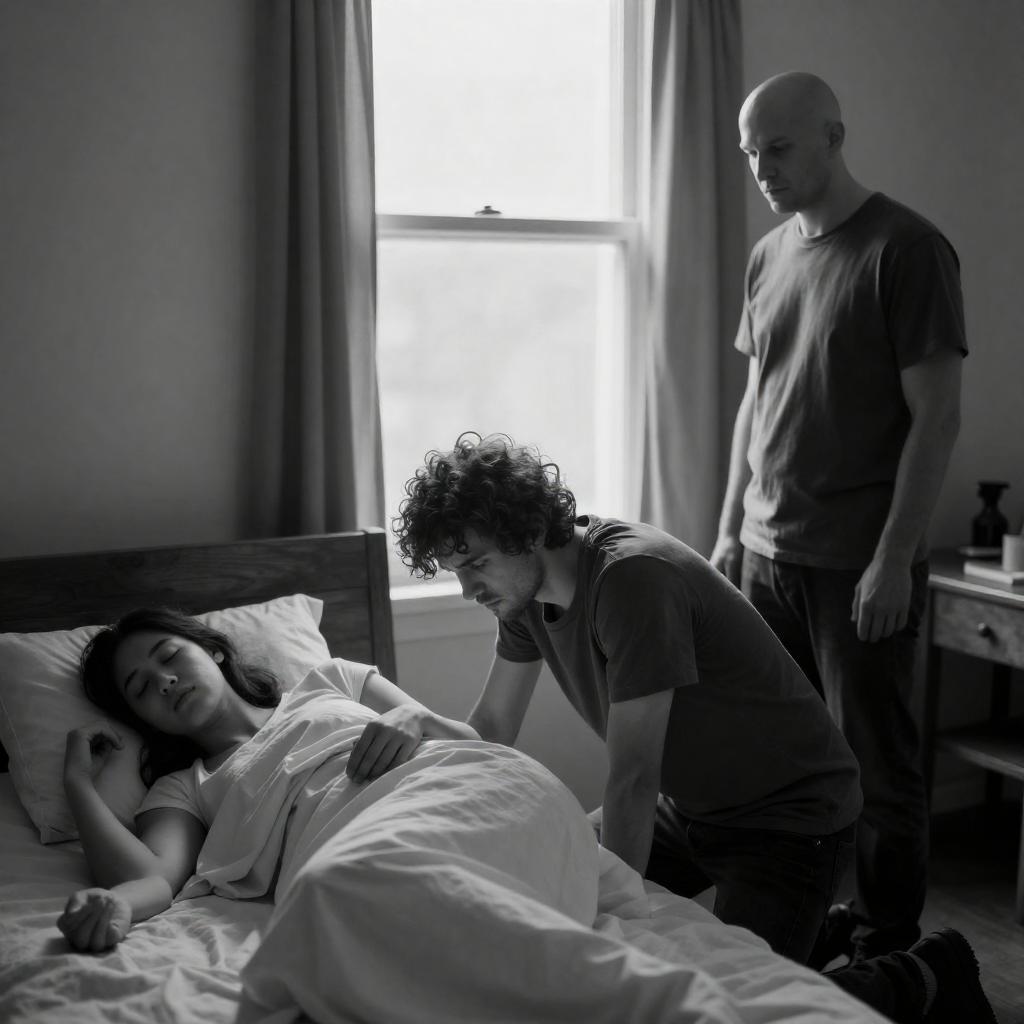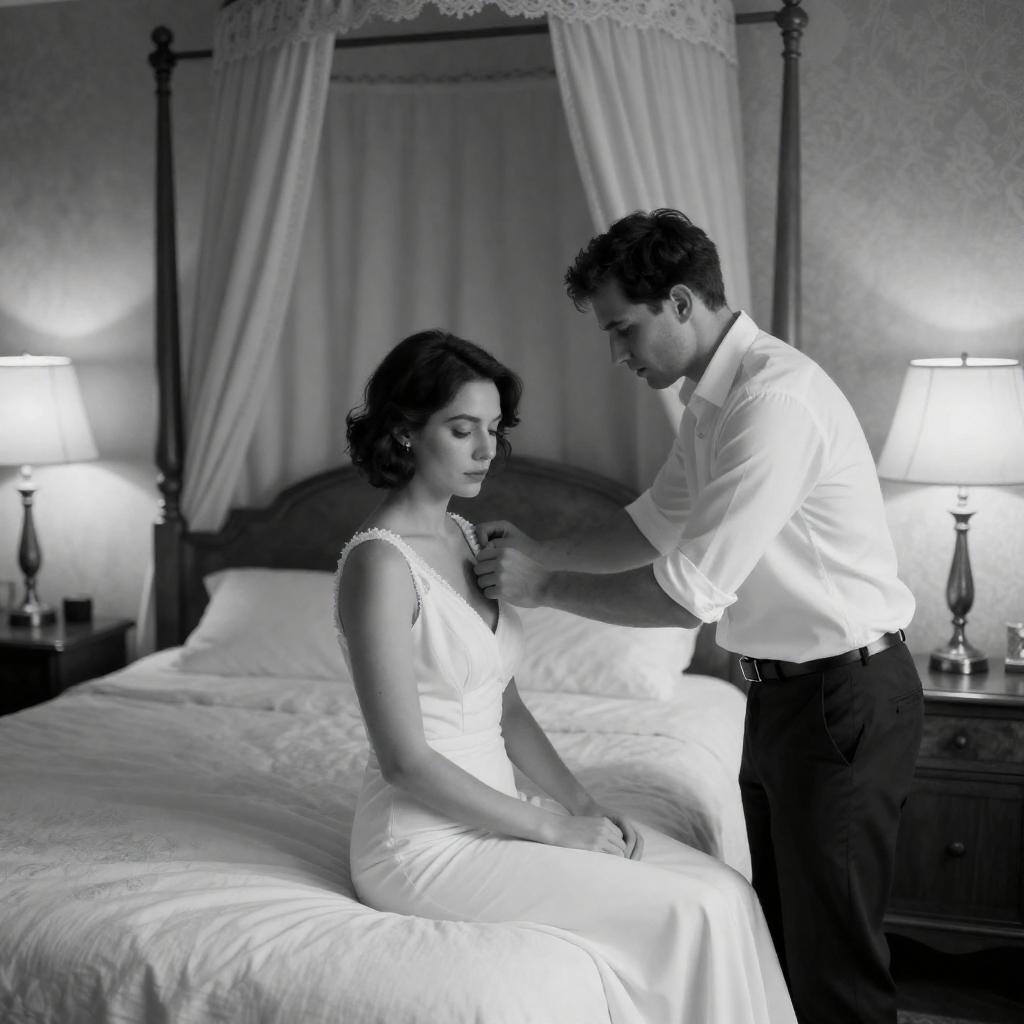 Black and white photograph of a man with short hair and a vest standing behind a woman with dark hair, leaning over her. She sits on a bed, looking down. Bed with white sheets, framed picture on wall. Green background.