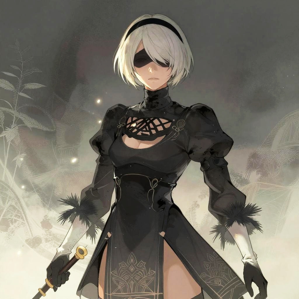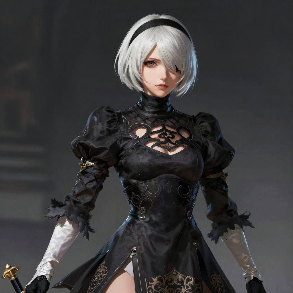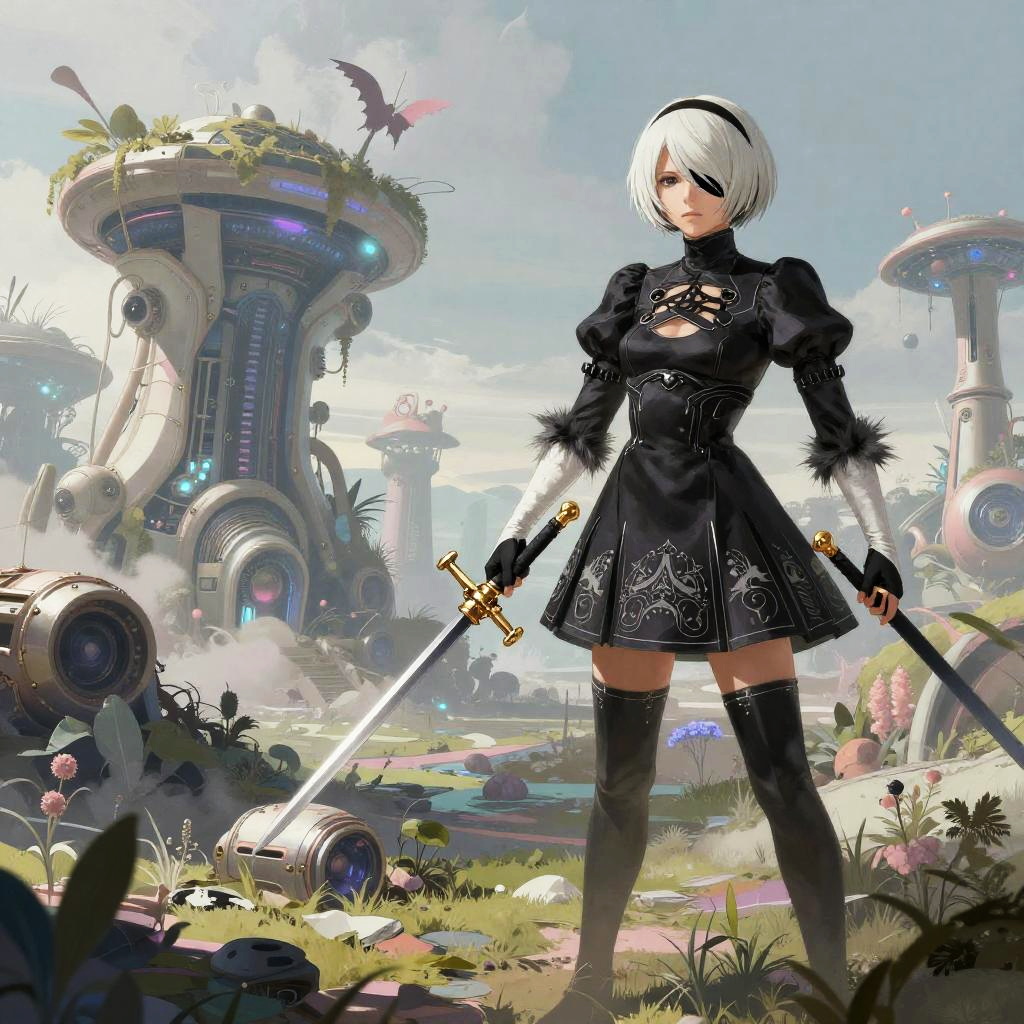 This digital artwork features a white-haired, black-eyed female android warrior with a short bob haircut, standing confidently in a futuristic, sci-fi landscape. She wears a black, form-fitting dress with puffed sleeves, feather accents, and intricate white floral embroidery. She holds a glowing sword in her right hand and has a matching sheath with a sword in her left. Her outfit is complemented by thigh-high black stockings. The background showcases tall, cylindrical, sci-fi structures adorned with greenery and small flying creatures. The sky is bright blue with scattered clouds, and the ground is a mix of grass and flowers. The overall style is vibrant and detailed, reminiscent of high-fantasy and cyberpunk themes.