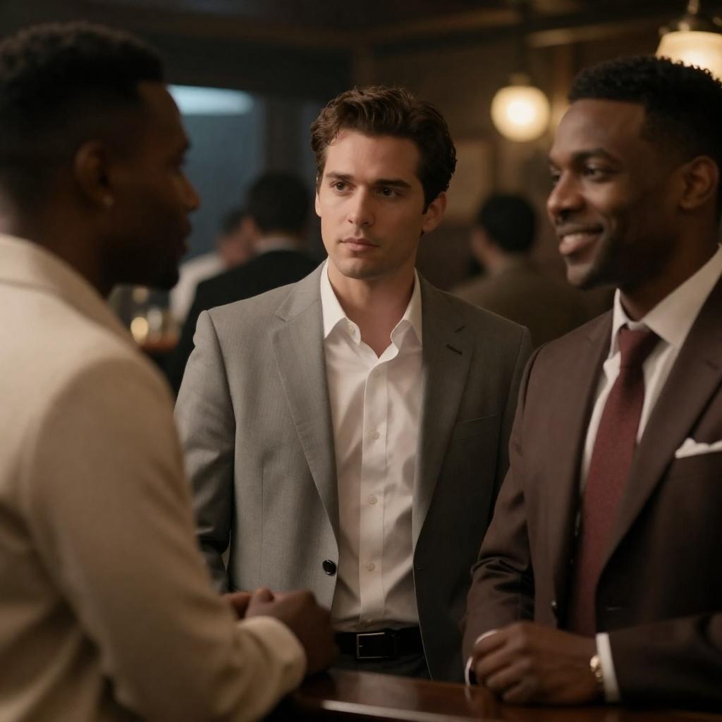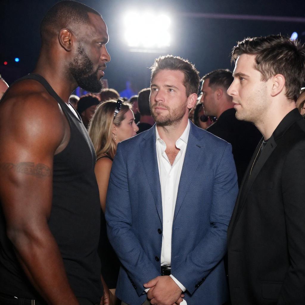Photograph of four people at a crowded event. A tall, muscular black man with a beard stands on the left. A white man with brown hair and a blue blazer stands in the center, holding a white object. A white man with dark hair and a black jacket stands on the right, looking at the central man. A blonde woman with a headband is partially visible behind the central man. Bright lights and blurred crowd in the background. Intense expressions.