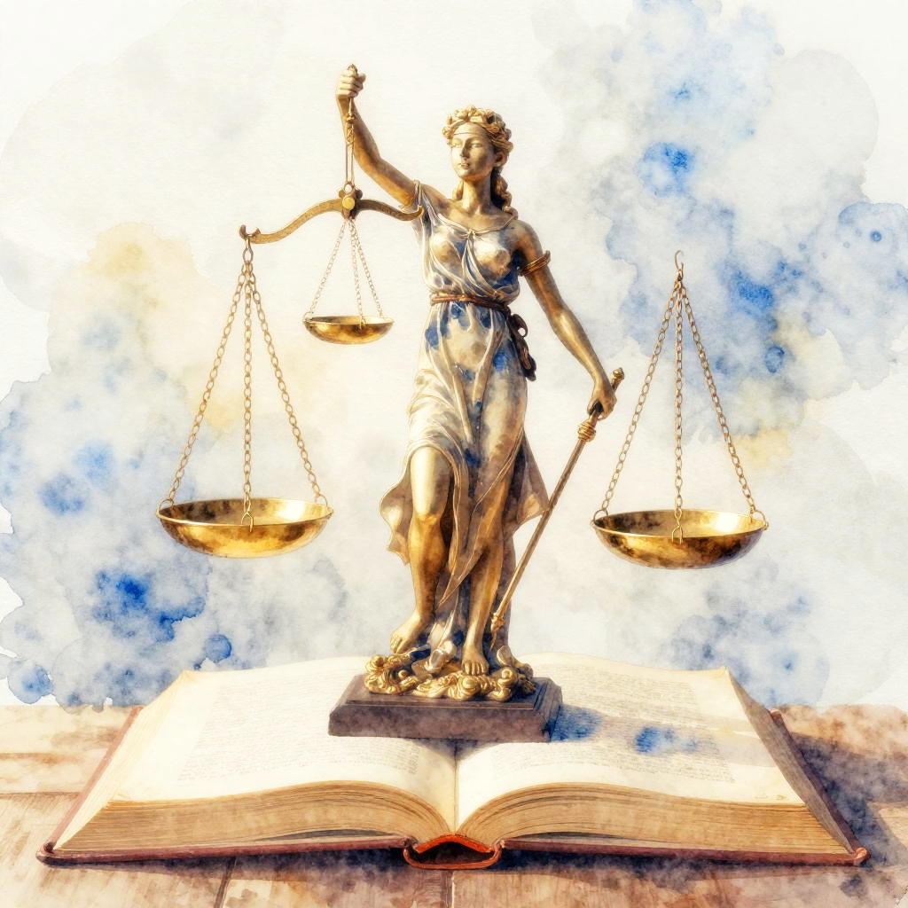 Lady Justice balance scale floating above an open law book, ethereal light illuminating the scene, delicate chains and perfectly balanced pans, soft watercolor effect with a blend of warm gold and cool blue hues, dreamlike and symbolic composition.