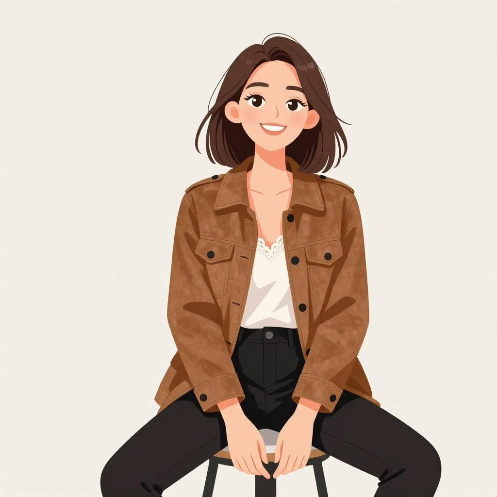 Woman with pretty face and pretty hair. smiling Woman, casual chic, soft brown suede jacket, relaxed fit, notched lapels, open front, large patch pockets, white delicate lace camisole underneath, black skinny trousers, sitting on a white stool, plain light background. --sref 1467