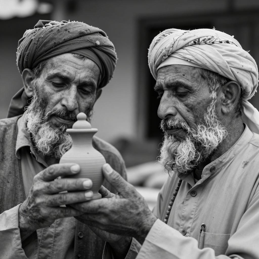 Black-and-white photograph of two elderly bearded men wearing traditional headscarves, closely examining a handcrafted clay figurine. Both men show signs of dirt and wear on their skin and clothing. The background is blurred, keeping focus on their concentrated expressions and the detailed texture of the clay object.