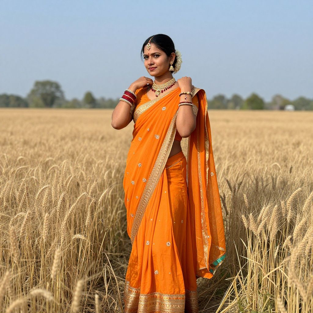 Rural Indian woman standing gracefully in a golden wheat field, adorned in vibrant orange attire and traditional jewelry, with a serene backdrop of distant trees and a clear blue sky.