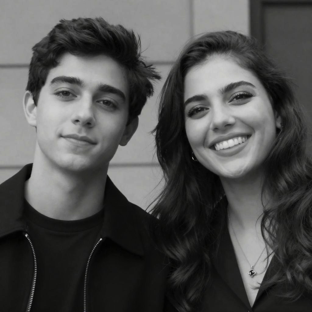 Black and white photograph of a young man with dark hair and a woman with wavy hair, smiling. Man on left, woman on right, both wearing dark clothing. Woman's smile is bright, man's expression neutral. Background slightly blurred. Both looking slightly upwards.